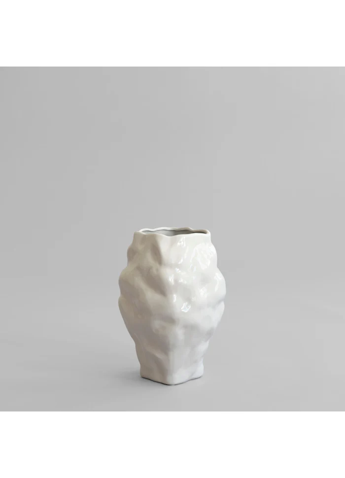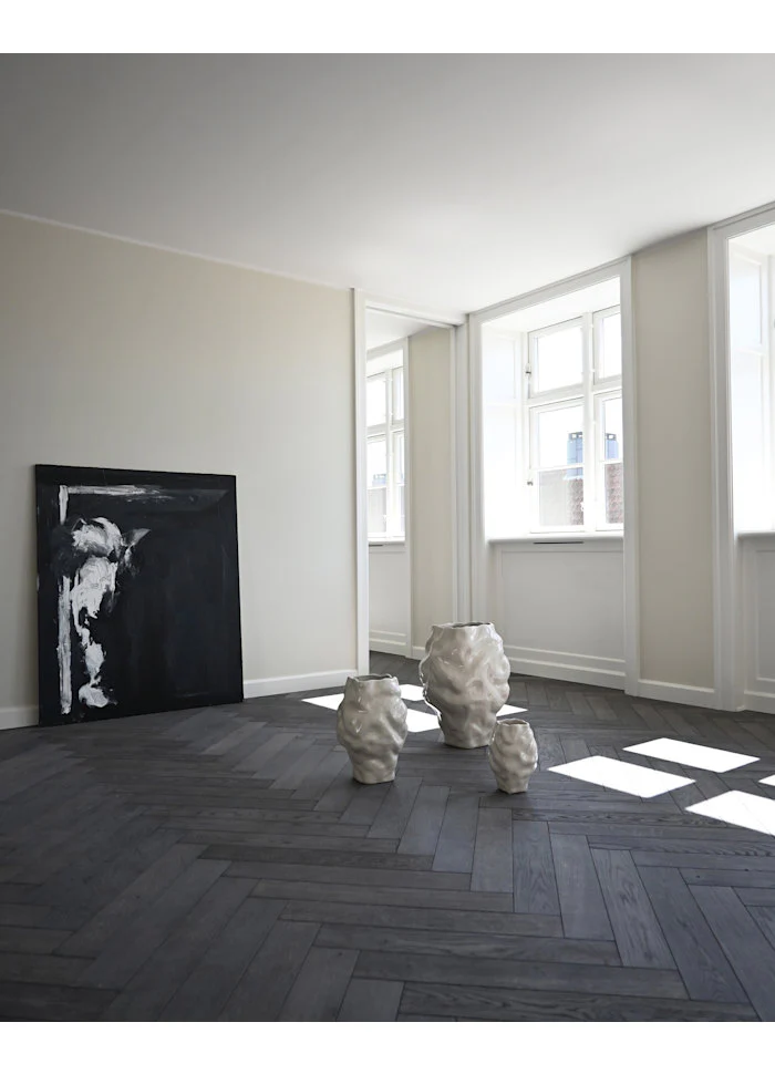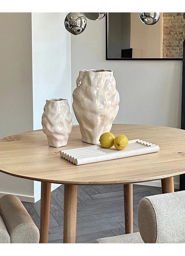 花瓶採用 高光澤陶瓷釉面,如同流動的鏡面般映照周圍環境,進一步強化光與質感的交織。光滑的釉面與粗獷不規則的造型形成鮮明對比,使每一件作品同時展現出精緻與雕塑感。