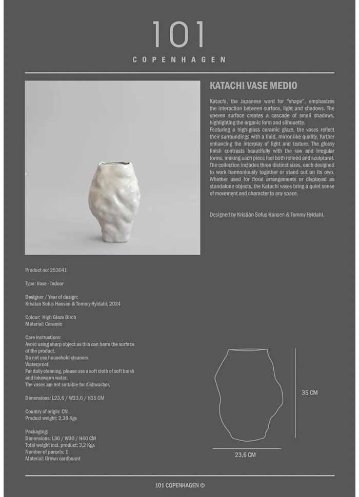 系列共包含三種尺寸,可相互搭配呈現和諧之美,也能單獨擺放成為焦點。無論用於花藝搭配或純粹作為裝飾物,Katachi Vase 都能為空間注入低調卻富有動態感的個性。