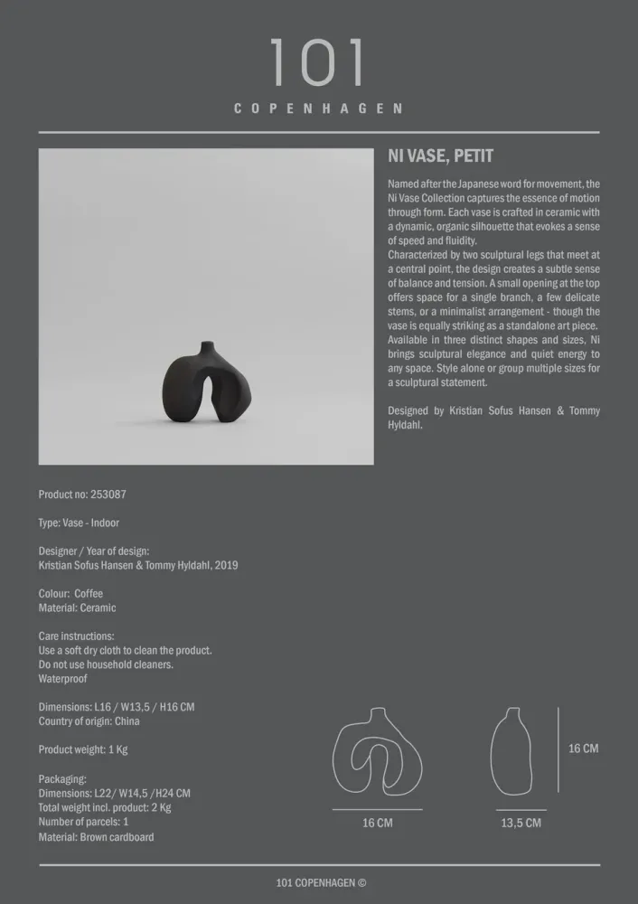 以日文中代表「律動」的詞彙命名,Ni 花器系列透過造型捕捉了運動的本質。每一只花器皆以陶瓷製作,呈現充滿張力與流動感的有機輪廓,喚起速度與流暢的意象。