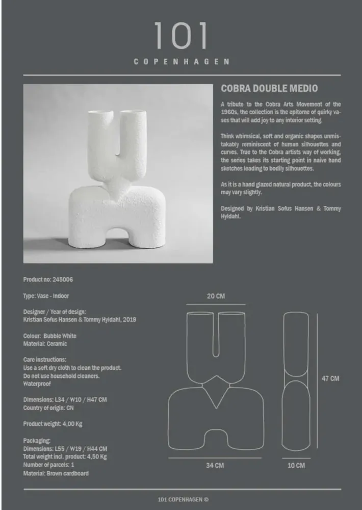 該系列向 1960 年代的 Cobra 藝術運動致敬,是充滿奇趣線條與個性的花瓶縮影,為任何室內空間注入愉悅氛圍。造型異想天開、柔和且富有機感,輪廓明顯呼應人體姿態與曲線。延續 Cobra 藝術家的創作方式,本系列以直覺性的手繪草圖為起點,逐步發展出富含身體意象的雕塑般造型。