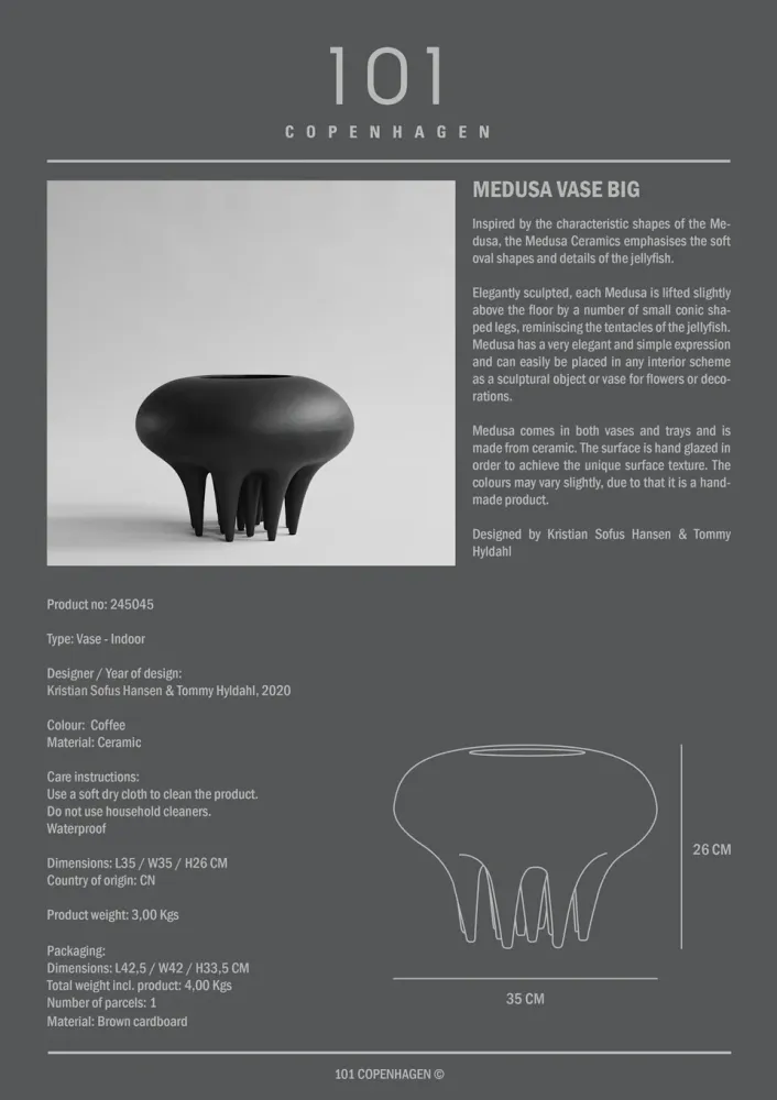 受美杜莎獨特形狀的啟發,美杜莎陶瓷強調了柔軟的橢圓形和水母的細節。優雅的雕刻,美杜莎花瓶底座由許多小圓錐形腿略微抬離地板,讓人想起水母的觸鬚。可以輕鬆放置在任何室內設計中,可作為雕塑品或花瓶裝飾品。美杜莎有花瓶和托盤兩種形式,由陶瓷製成。