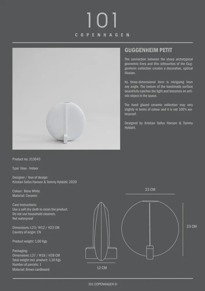Guggenheim 系列藉由鮮明典型的幾何線條與纖薄的輪廓之間的牽動聯繫創造出的設計品。視覺上的交錯在平面器皿是個立體且任何一個角度看都有趣。手工製作的表面紋理及切面細緻的捕捉光線,是空間裡的藝術品。