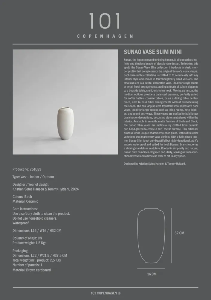 「素直」,源自日語,意為「純粹、誠實」,Sunao Vase Slim系列承襲經典設計,並以細長輪廓帶來優雅新意,完美融入多種空間風格。