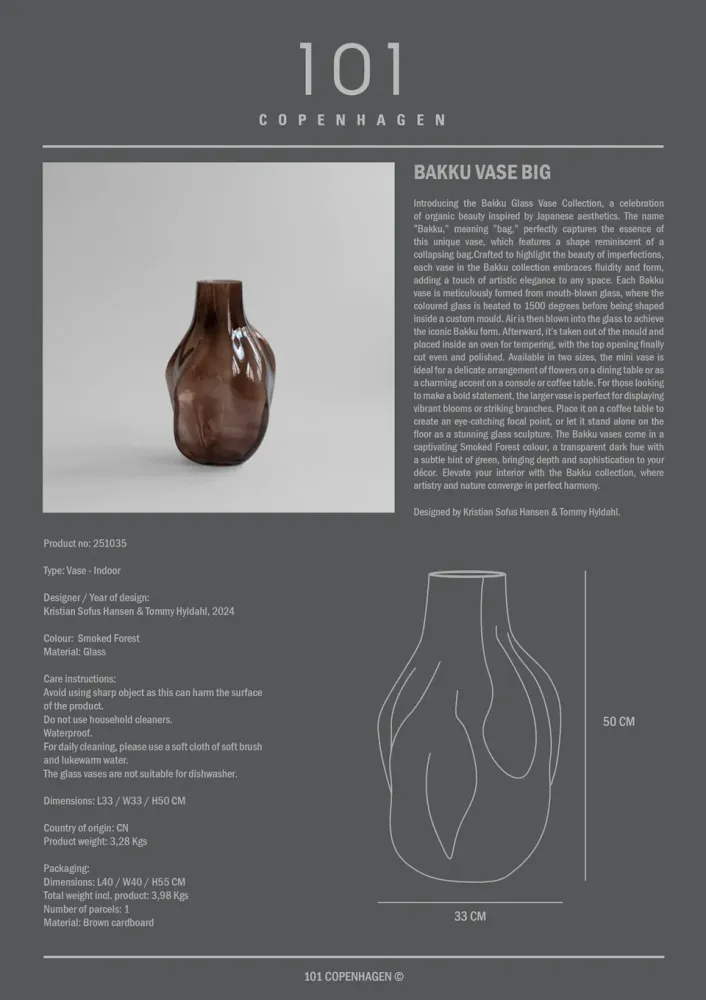 此系列提供兩種尺寸,小款適合作為餐桌上的花藝擺設,也可點綴玄關桌或咖啡桌;大款則適合展示豐盈花卉或造型獨特的枝條,可擺放於咖啡桌上作為視覺焦點,亦可獨立置於地面,呈現雕塑般的藝術效果。煙霧森林色為深色透明調,帶有微妙的古銅光澤,為空間增添層次與優雅氣息。