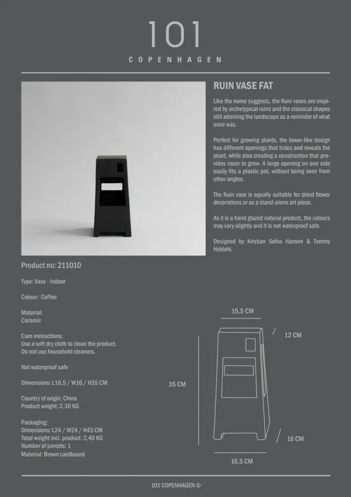 Ruin 花瓶的靈感來自於典型的廢墟形狀,作為花瓶仍然可以裝飾著風景,提醒人們曾經的樣子。適合種植植物,塔狀設計有不同的開口,可以從不同覺度觀賞植物的生長,同時還創造了一個提供生長空間的結構。Ruin 花瓶同樣適合乾燥花裝飾或作為獨立的藝術品。
