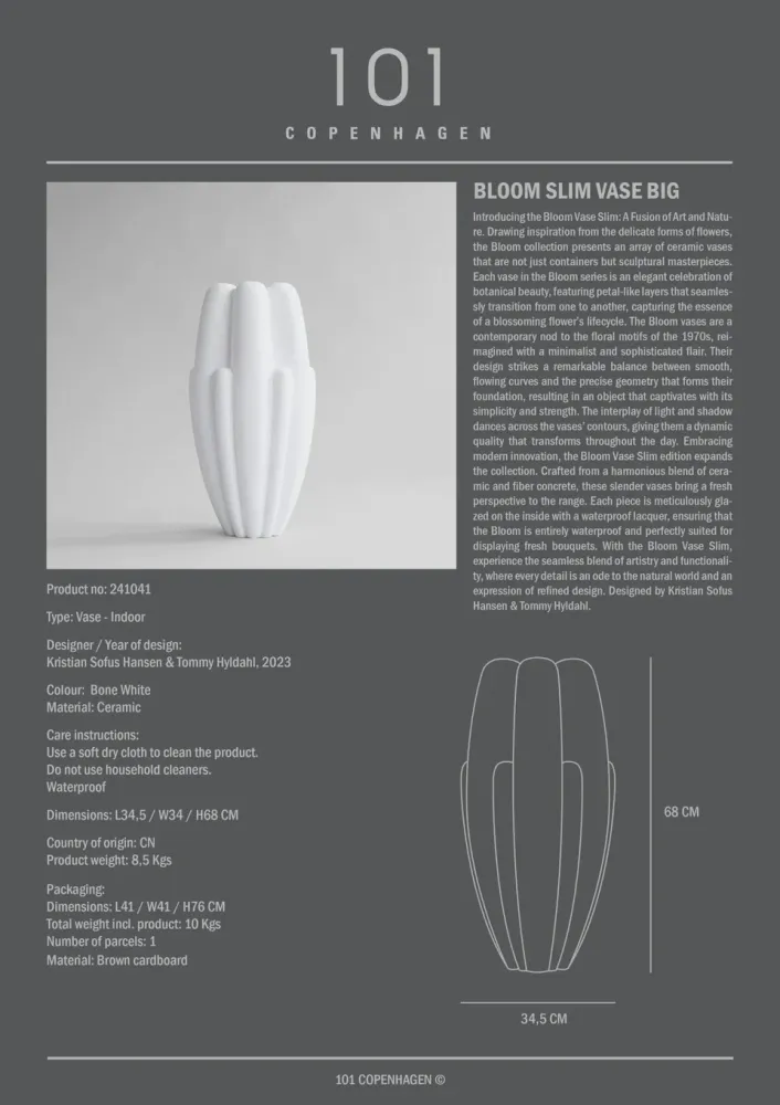 Bloom Vase Slim是對該系列的延伸,採用陶瓷與纖維混凝土的融合,呈現纖細的設計,為系列帶來嶄新視角。