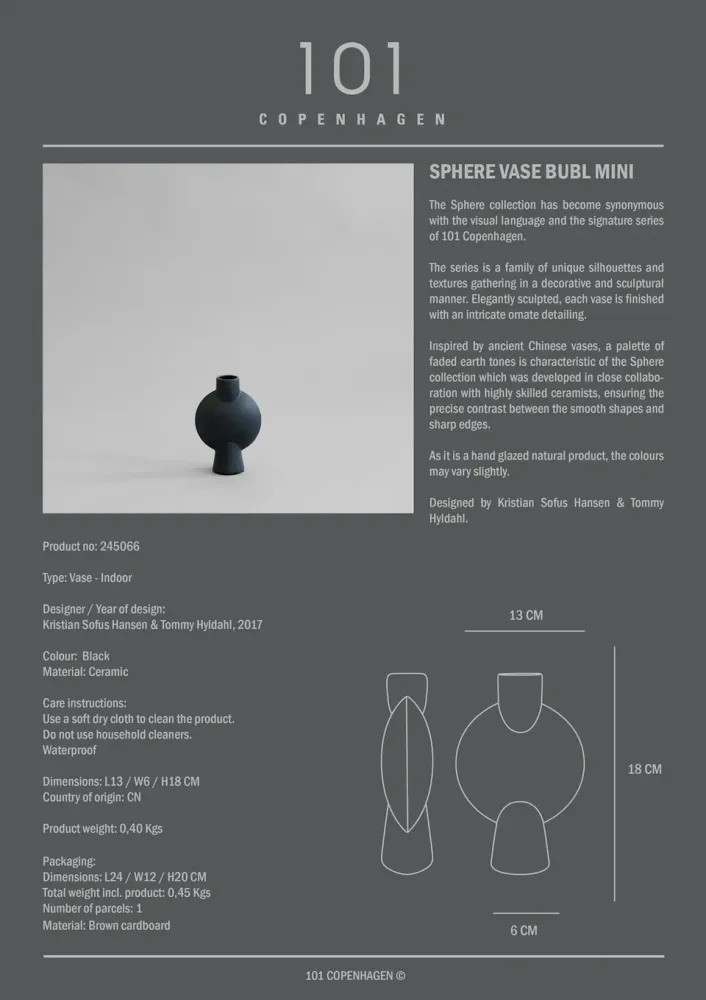Sphere 系列已成為 101 Copenhagen 標誌性的設計語彙與代表作品。此系列集合了多種獨特的輪廓與質地,以裝飾和雕塑感的方式呈現。每個花瓶都經過精美的雕刻,並帶有細緻精巧的裝飾細節。受古代中國花瓶的啟發,Sphere系列的特色是褪色的大地色調。該系列是在與經驗豐富的陶藝師密切合作下開發而成,確保每件作品在柔和造型與銳利稜角之間取得完美對比。