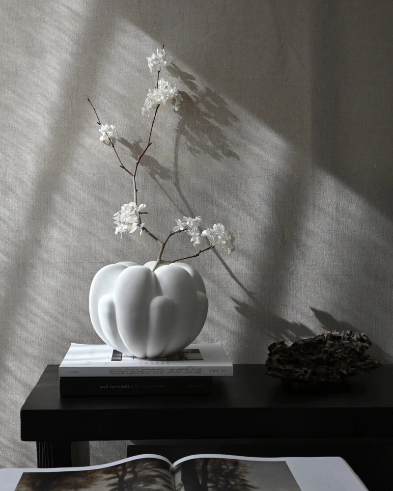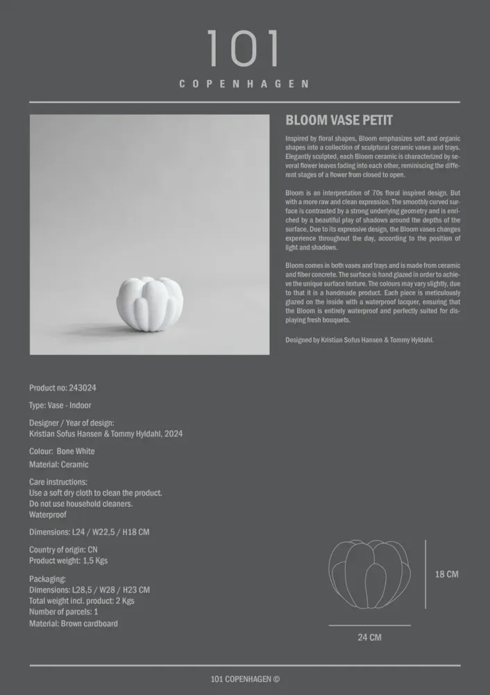 受到花卉形狀的啟發,Bloom 系列強調柔和的有機形狀,將雕塑感的陶瓷花瓶和托盤融入設計。每個作品的設計靈感來自花朵開合的不同階段,其特點是幾片花葉相互褪色,呈現花瓣彼此交融的樣貌。