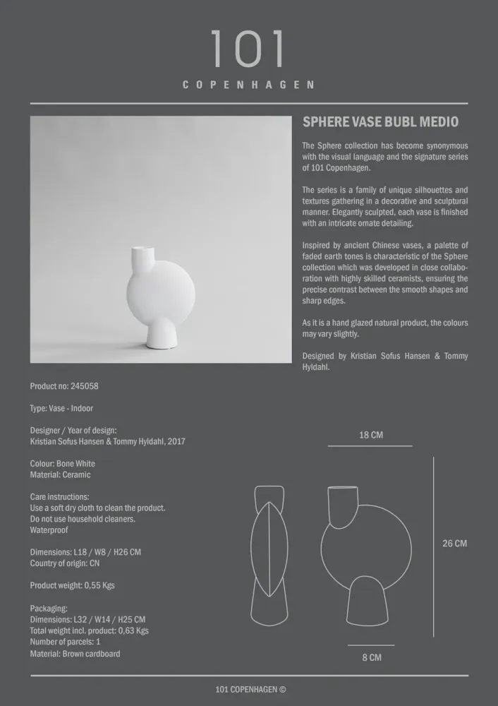 Sphere 系列已成為 101 Copenhagen 標誌性的設計語彙與代表作品。此系列集合了多種獨特的輪廓與質地,以裝飾和雕塑感的方式呈現。每個花瓶都經過精美的雕刻,並帶有細緻精巧的裝飾細節。受古代中國花瓶的啟發,Sphere系列的特色是褪色的大地色調。該系列是在與經驗豐富的陶藝師密切合作下開發而成,確保每件作品在柔和造型與銳利稜角之間取得完美對比。