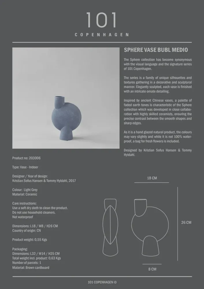 Sphere 系列已成為 101 Copenhagen 標誌性的設計語彙與代表作品。此系列集合了多種獨特的輪廓與質地,以裝飾和雕塑感的方式呈現。每個花瓶都經過精美的雕刻,並帶有細緻精巧的裝飾細節。受古代中國花瓶的啟發,Sphere系列的特色是褪色的大地色調。該系列是在與經驗豐富的陶藝師密切合作下開發而成,確保每件作品在柔和造型與銳利稜角之間取得完美對比。