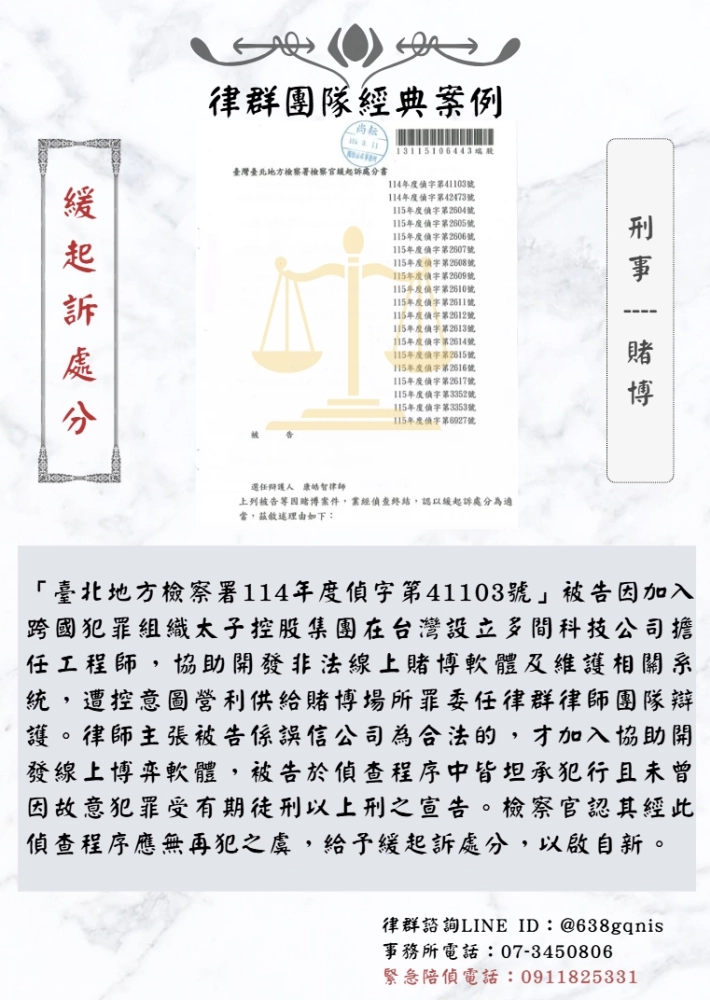 「臺北地方檢察署114年度偵字第41103號」被告因加入跨國犯罪組織太子控股集團在台灣設立多間科技公司擔任工程師,協助開發非法線上賭博軟體及維護相關系統,遭控意圖營利供給賭博場所罪委任律群律師團隊辯護。律師主張被告係誤信公司為合法的,才加入協助開發線上博弈軟體,被告於偵查程序中皆坦承犯行且未曾因故意犯罪受有期徒刑以上刑之宣告。檢察官認其經此偵查程序應無再犯之虞,給予緩起訴處分,以啟自新。