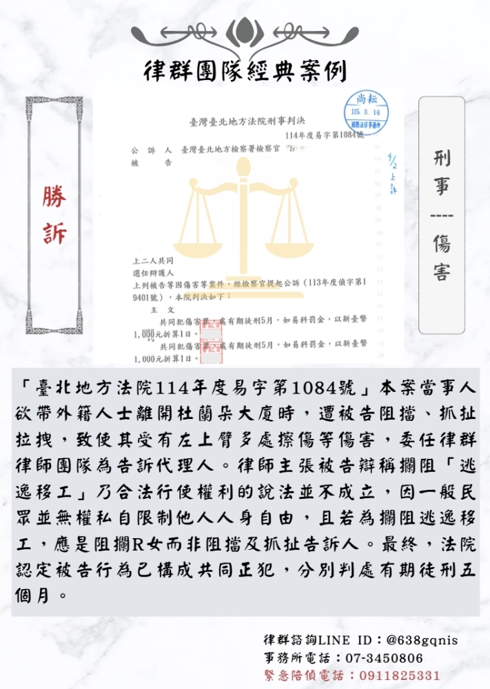 「臺北地方法院114年度易字第1084號」本案當事人欲帶外籍人士離開杜蘭朵大廈時,遭被告阻擋、抓扯拉拽,致使其受有左上臂多處擦傷等傷害,委任律群律師團隊為告訴代理人。律師主張被告辯稱攔阻「逃逸移工」乃合法行使權利的說法並不成立,因一般民眾並無權私自限制他人人身自由,且若為攔阻逃逸移工,應是阻攔R女而非阻擋及抓扯告訴人。最終,法院認定被告行為已構成共同正犯,分別判處有期徒刑五個月。