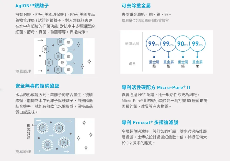 擁有NSF、EPA(美國環保署)、FDA(美國食品藥物管理局)認證的銀離子,對人類既無害更在水中有超強的抑菌功能!對抗水中多種類型的細菌、酵母、真菌、黴菌等等,捍衛純淨。