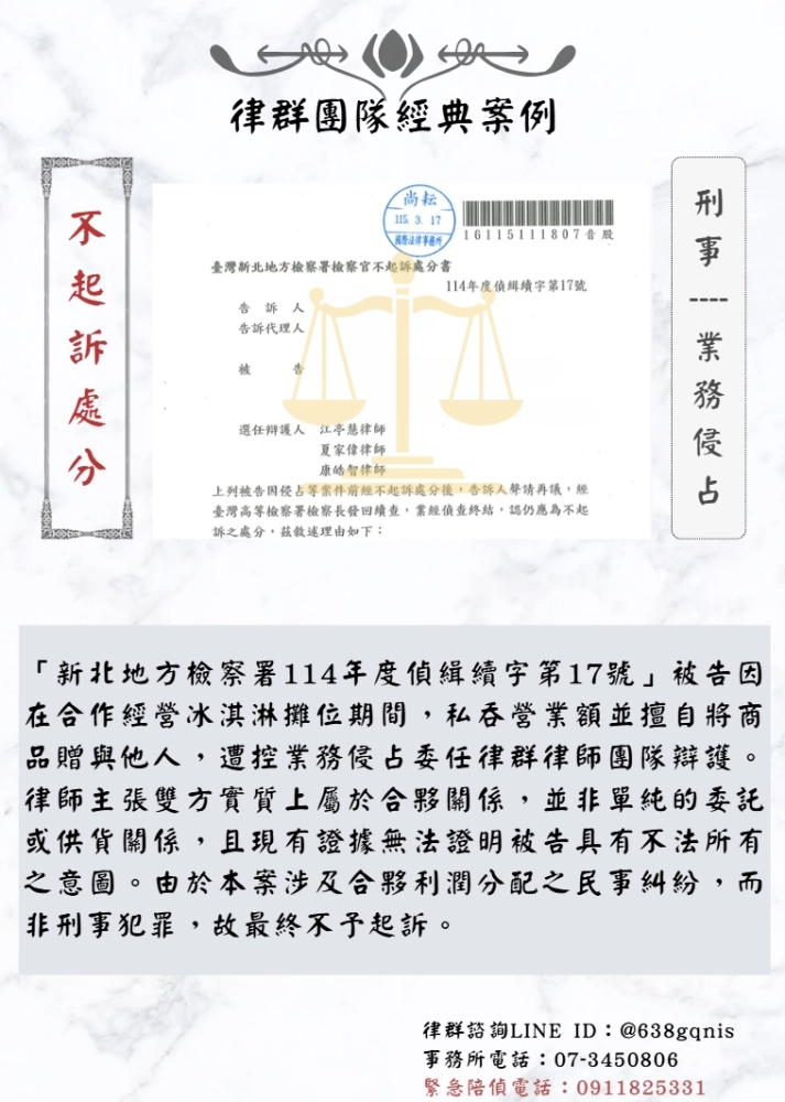 「新北地方檢察署114年度偵緝續字第17號」被告因在合作經營冰淇淋攤位期間,私吞營業額並擅自將商品贈與他人,遭控業務侵占委任律群律師團隊辯護。律師主張雙方實質上屬於合夥關係,並非單純的委託或供貨關係,且現有證據無法證明被告具有不法所有之意圖。由於本案涉及合夥利潤分配之民事糾紛,而非刑事犯罪,故最終不予起訴。