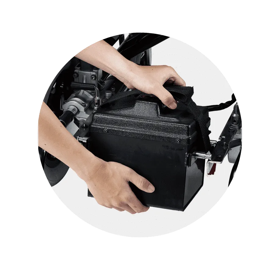 電池盒免工具簡易快拆,方便拆卸攜帶。輪椅輕鬆收合,隨行出門,滿足需求!俐落中型車 探索都市叢林