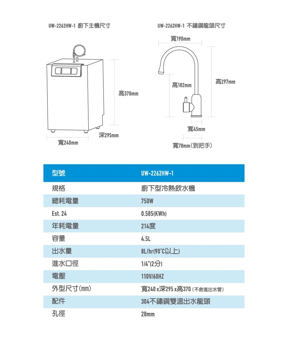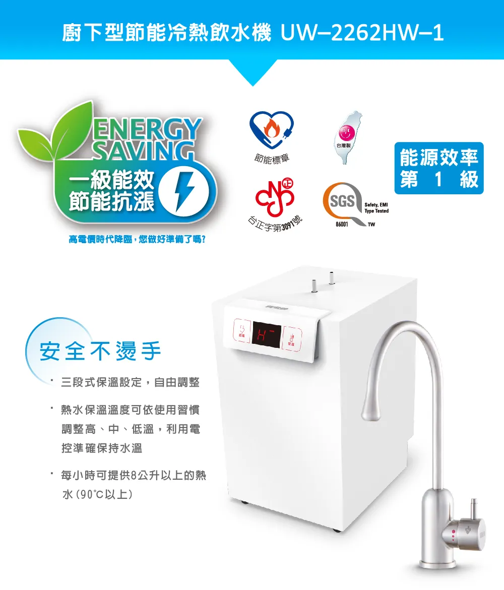 商品UW-2212HW-1 LED觸控式廚下型節能冷熱飲水機