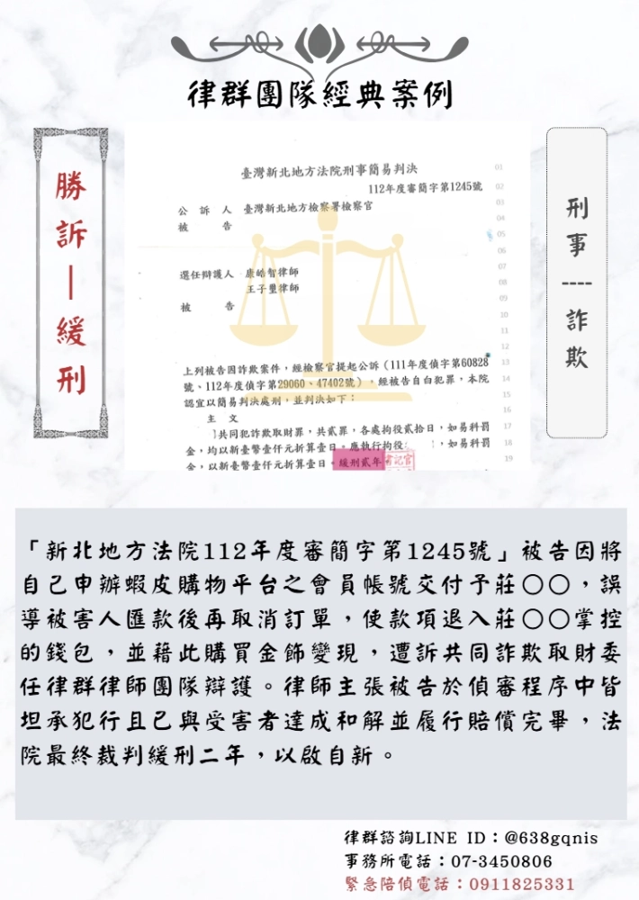 「新北地方法院112年度審簡字第1245號」被告因將自己申辦蝦皮購物平台之會員帳號交付予莊○○,誤導被害人匯款後再取消訂單,使款項退入莊○○掌控的錢包,並藉此購買金飾變現,遭訴共同詐欺取財委任律群律師團隊辯護。律師主張被告於偵審程序中皆坦承犯行且已與受害者達成和解並履行賠償完畢,法院最終裁判緩刑二年,以啟自新。