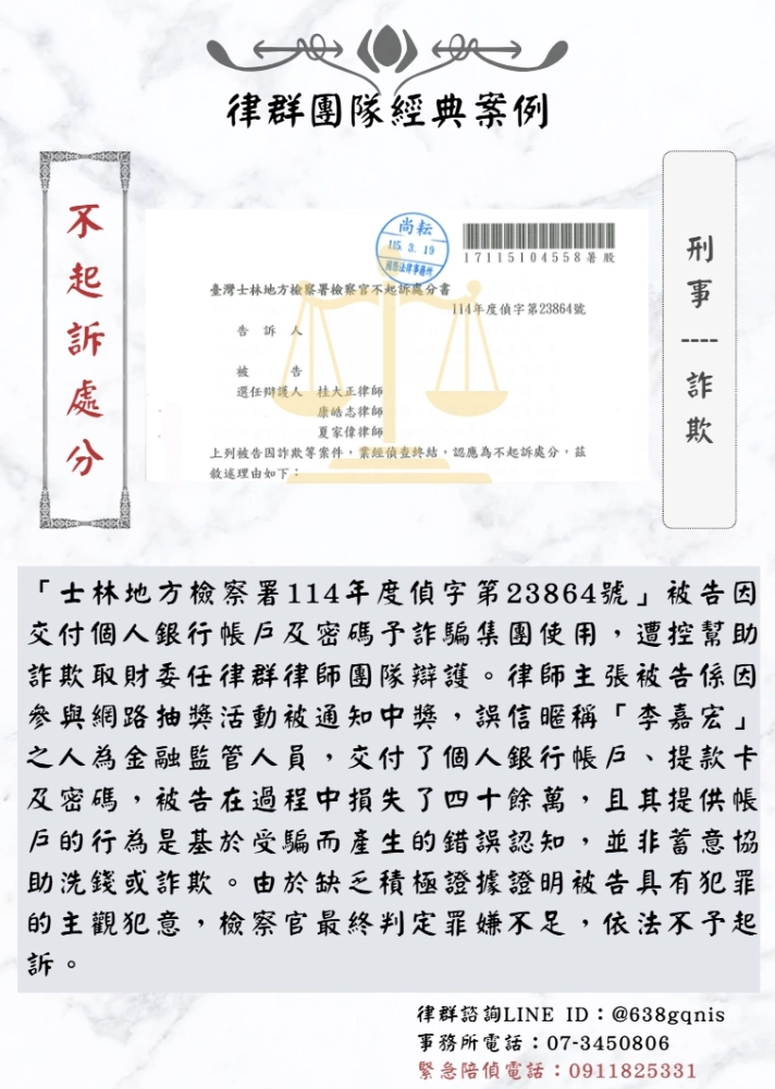 「士林地方檢察署114年度偵字第23864號」被告因交付個人銀行帳戶及密碼予詐騙集團使用,遭控幫助詐欺取財委任律群律師團隊辯護。律師主張被告係因參與網路抽獎活動被通知中獎,誤信暱稱「李嘉宏」之人為金融監管人員,交付了個人銀行帳戶、提款卡及密碼,被告在過程中損失了四十餘萬,且其提供帳戶的行為是基於受騙而產生的錯誤認知,並非蓄意協助洗錢或詐欺。由於缺乏積極證據證明被告具有犯罪的主觀犯意,檢察官最終判定罪嫌不足,依法不予起訴。