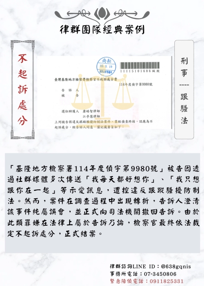 「基隆地方檢察署114年度偵字第9980號」被告因透過社群媒體多次傳送「我每天都好想你」、「我只想跟你在一起」等示愛訊息,遭控違反跟蹤騷擾防制法。然而,案件在調查過程中出現轉折,告訴人澄清該事件純屬誤會,並正式向司法機關撤回告訴。由於此類罪嫌在法律上屬於告訴乃論,檢察官最終依法裁定不起訴處分,正式結案。