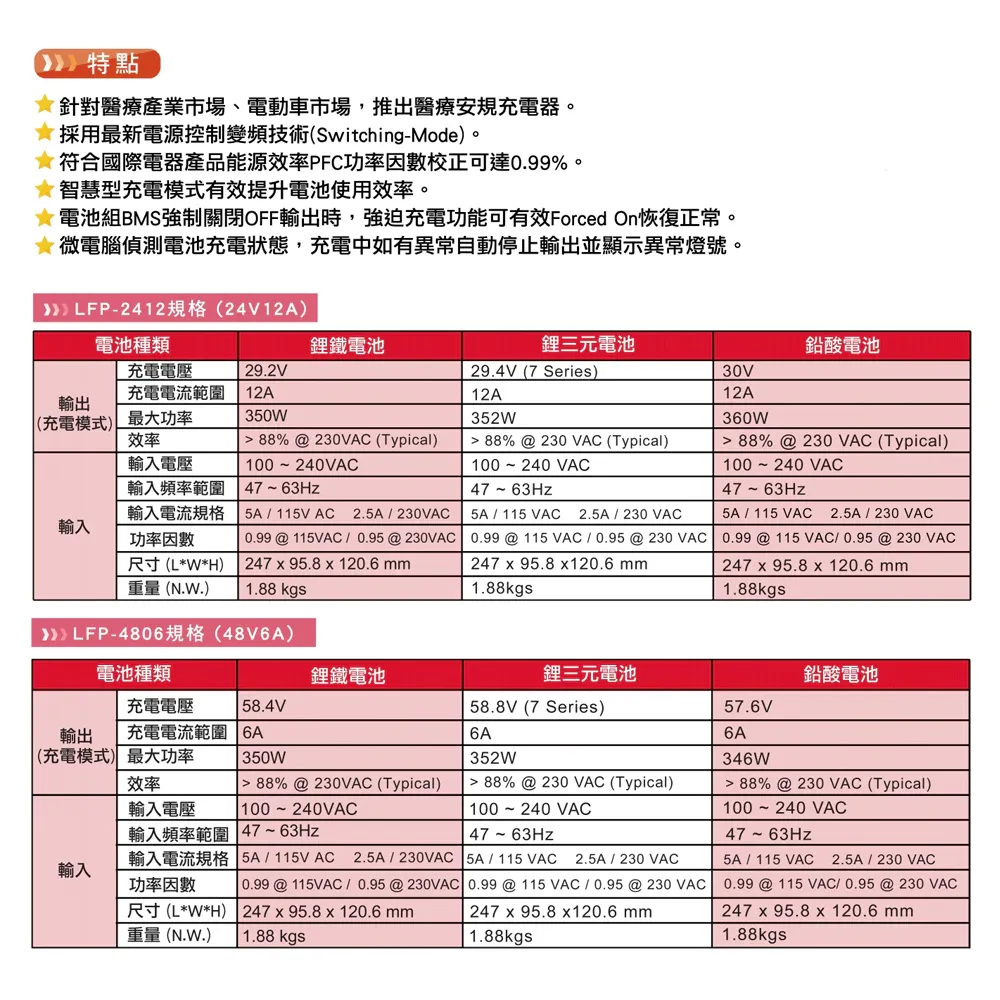 商品麻新電子 LFP-2412 24V 12A電池充電器 鋰鐵 台灣製造 一年保固