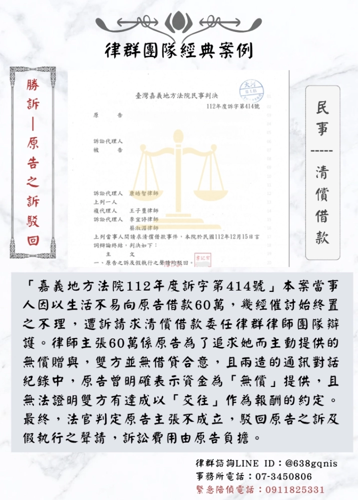 「嘉義地方法院112年度訴字第414號」本案當事人因以生活不易向原告借款60萬,幾經催討始終置之不理,遭訴請求清償借款委任律群律師團隊辯護。律師主張60萬係原告為了追求她而主動提供的無償贈與,雙方並無借貸合意,且兩造的通訊對話紀錄中,原告曾明確表示資金為「無償」提供,且無法證明雙方有達成以「交往」作為報酬的約定。最終,法官判定原告主張不成立,駁回原告之訴及假執行之聲請,訴訟費用由原告負擔。