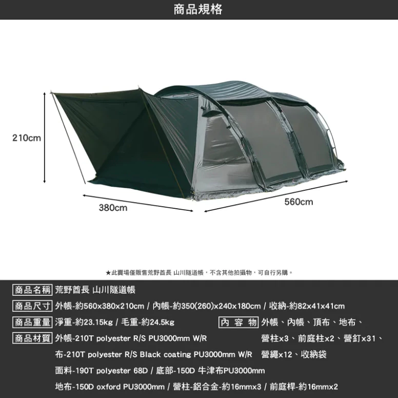 商品尺寸:外帳-約560x380x210cm / 內帳-350(260)x240x180cm