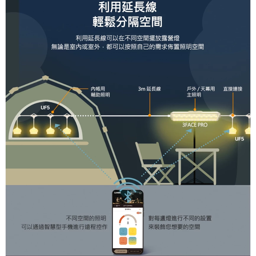🔹利用延長線可以在不同空間擺放露營燈,無論是室內或室外,都可以按照自己的需求佈置照明空間