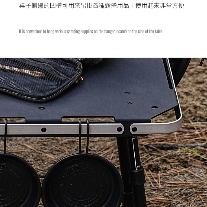 🔹桌子側邊的凹槽可用來吊掛各種露營用品,使用起來非常方便
