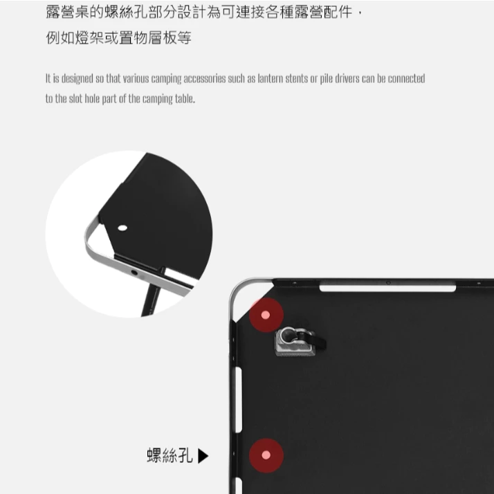 🔹露營桌的螺絲孔部分設計為可連接各種露營配件,例如燈架或置物層板等