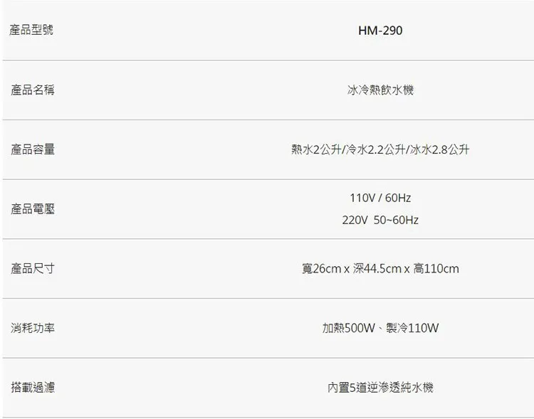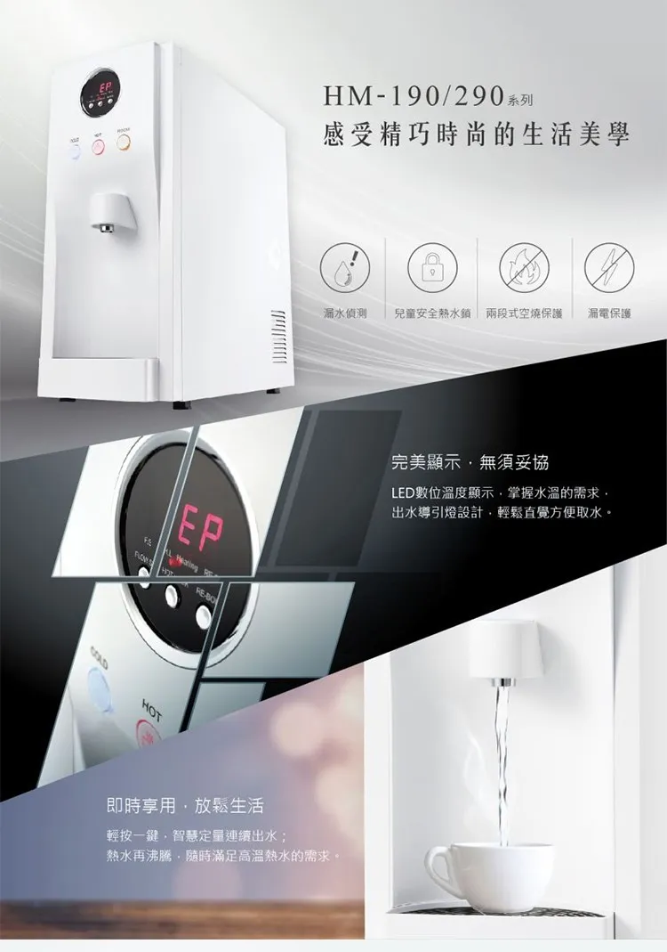 *搭配標準五道RO純水機,有效濾除細菌、重金屬、餘氯等有害物質 *採用高耐熱抗候ASA材質,優於傳統塑料不發黃龜裂 *六段式熱水保溫設計,可依喜好調整熱水溫度 *熱水鎖定防燙,避免兒童使用時造成燙傷 *熱缸採用食品級304不鏽鋼,確保飲水品質 *LED液晶顯示熱開水溫度,精準無誤 *熱水2L、溫水2.2L、冰水2.9L,即時享用多種用水需求