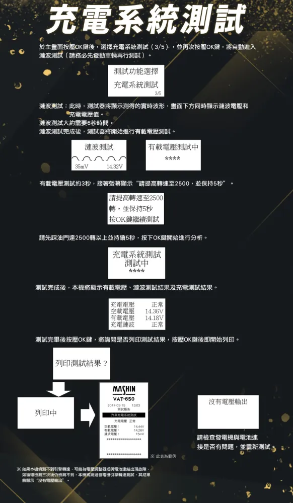 ◎充電系統測試分析車輛充電系統,取得發電機空載電壓、有載電壓與充電漣波