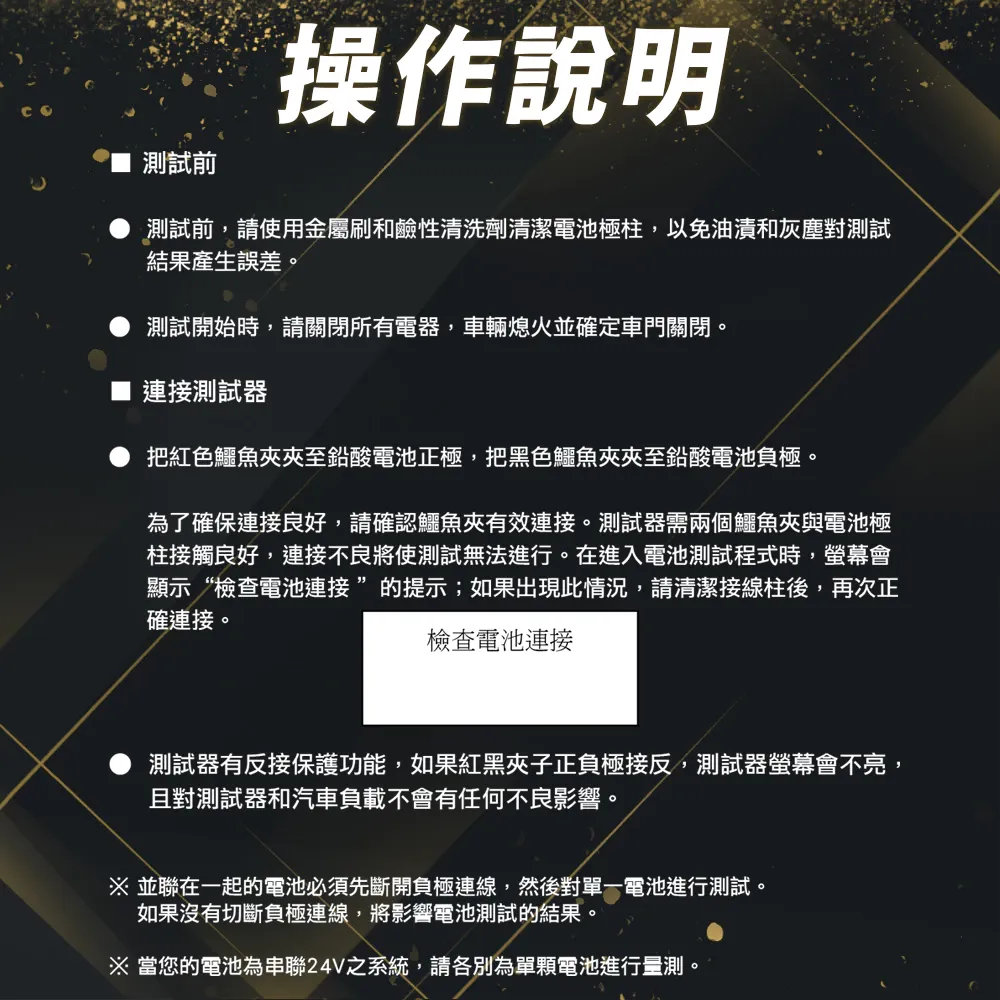 ■ 量測電池種類:CCA, BCI, CA, MCA, JIS, DIN, IEC, EN, SAE, GB