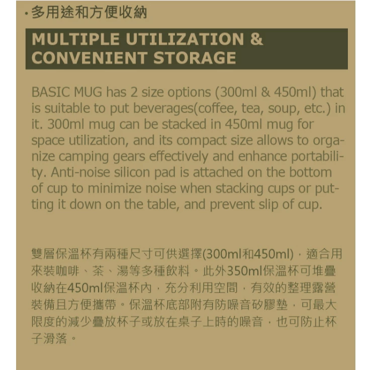 ◾350ml保温杯可堆疊收納在450ml保溫杯內,充分利用空間