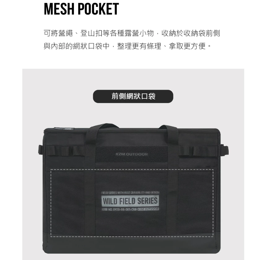 ◾可將營繩、登山扣等各種露營小物,收納於收納袋前側,與內部的網狀口袋中