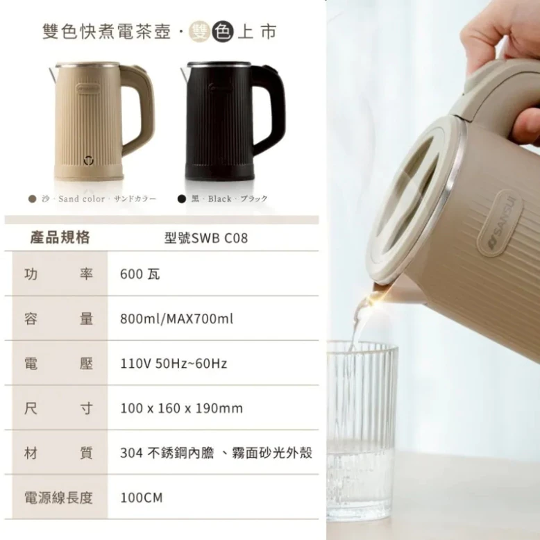 SANSUI 山水 低功率輕便煮水壺【綠色工場】】SWB-C08 輕行速熱壺 熱水壺 電熱水壺 快煮壺 電茶壺