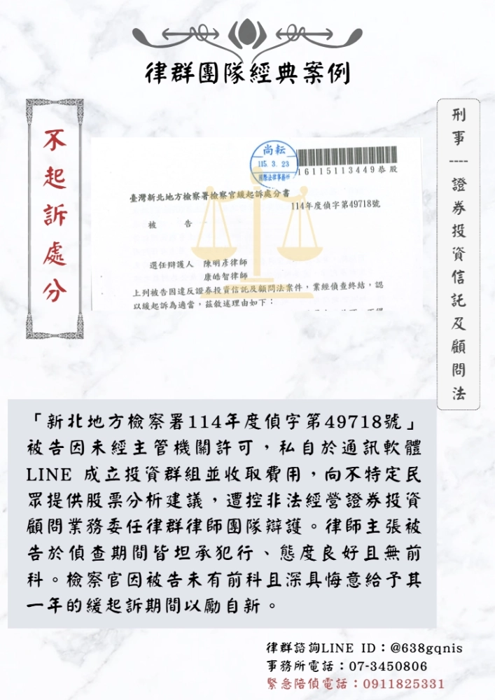 「新北地方檢察署114年度偵字第49718號」被告因未經主管機關許可,私自於通訊軟體 LINE 成立投資群組並收取費用,向不特定民眾提供股票分析建議,遭控非法經營證券投資顧問業務委任律群律師團隊辯護。律師主張被告於偵查期間皆坦承犯行、態度良好且無前科。檢察官因被告未有前科且深具悔意給予其一年的緩起訴期間以勵自新。
