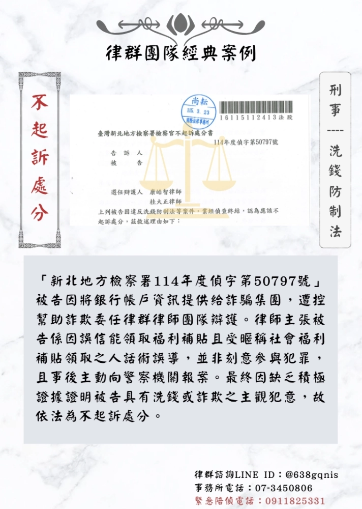 「新北地方檢察署114年度偵字第50797號」被告因將銀行帳戶資訊提供給詐騙集團,遭控幫助詐欺委任律群律師團隊辯護。律師主張被告係因誤信能領取福利補貼且受暱稱社會福利補貼領取之人話術誤導,並非刻意參與犯罪,且事後主動向警察機關報案。最終因缺乏積極證據證明被告具有洗錢或詐欺之主觀犯意,故依法為不起訴處分。