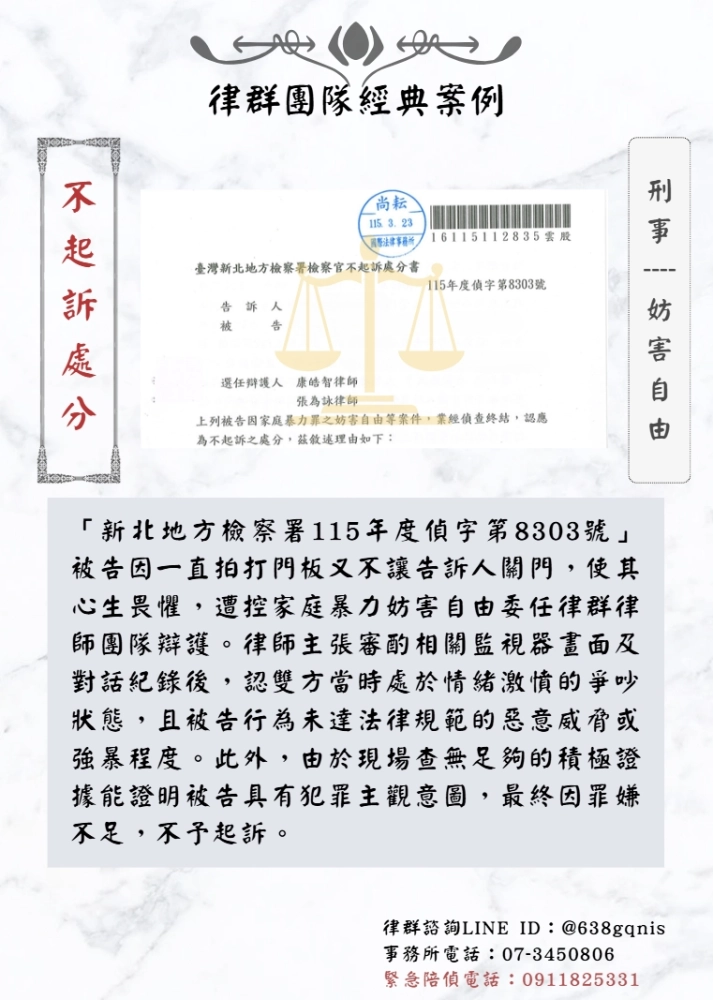 「新北地方檢察署115年度偵字第8303號」被告因一直拍打門板又不讓告訴人關門,使其心生畏懼,遭控家庭暴力妨害自由委任律群律師團隊辯護。律師主張審酌相關監視器畫面及對話紀錄後,認雙方當時處於情緒激憤的爭吵狀態,且被告行為未達法律規範的惡意威脅或強暴程度。此外,由於現場查無足夠的積極證據能證明被告具有犯罪主觀意圖,最終因罪嫌不足,不予起訴。