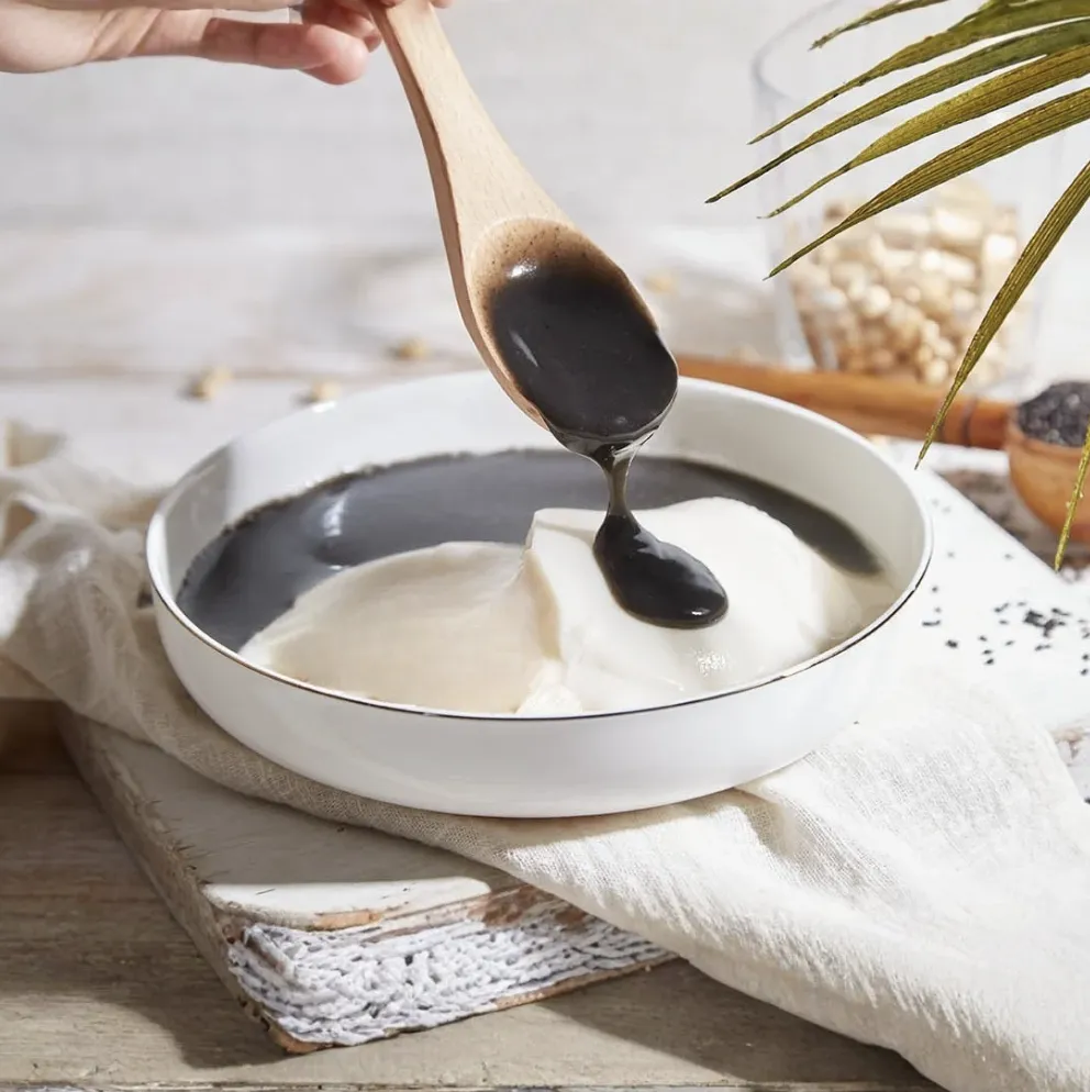 嚴選加拿大非基改黃豆、以日本壓榨脫渣技術,極速加熱蒸煮、直火熬煮,製作的傳統手工豆花、再淋上現煮香醇口感柔順的芝麻糊。