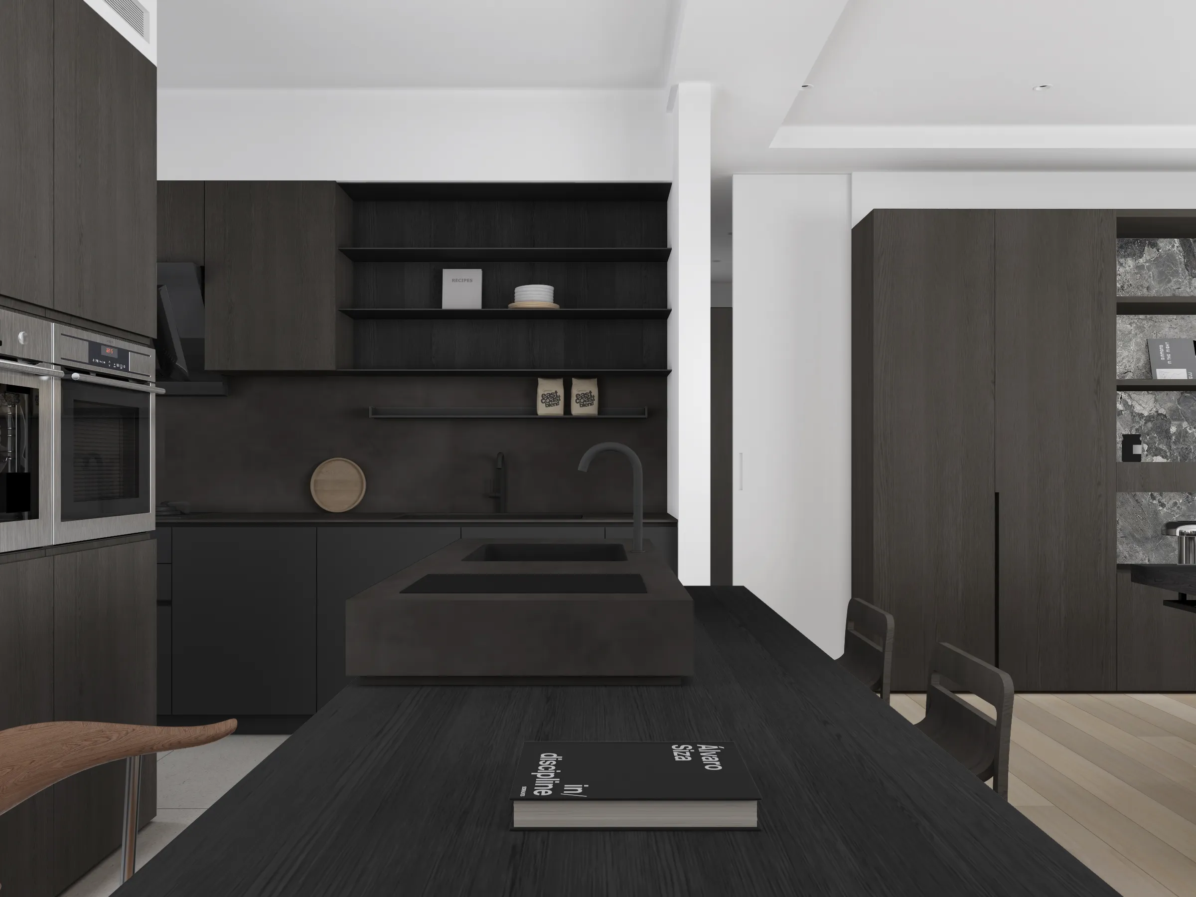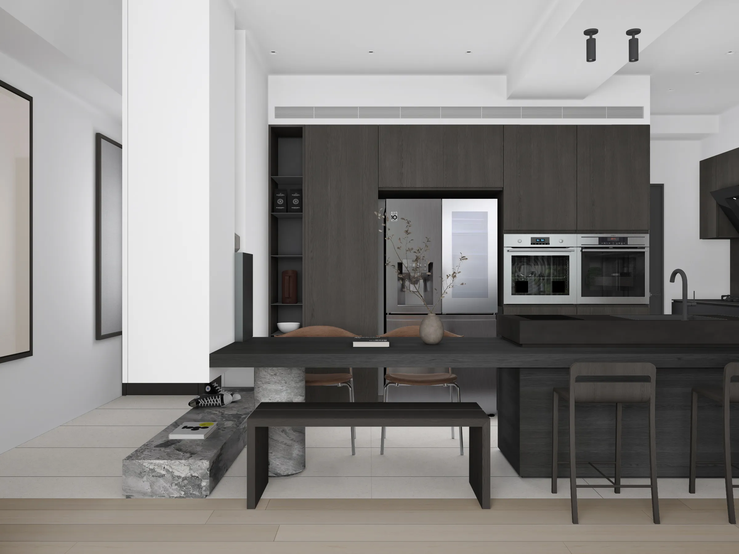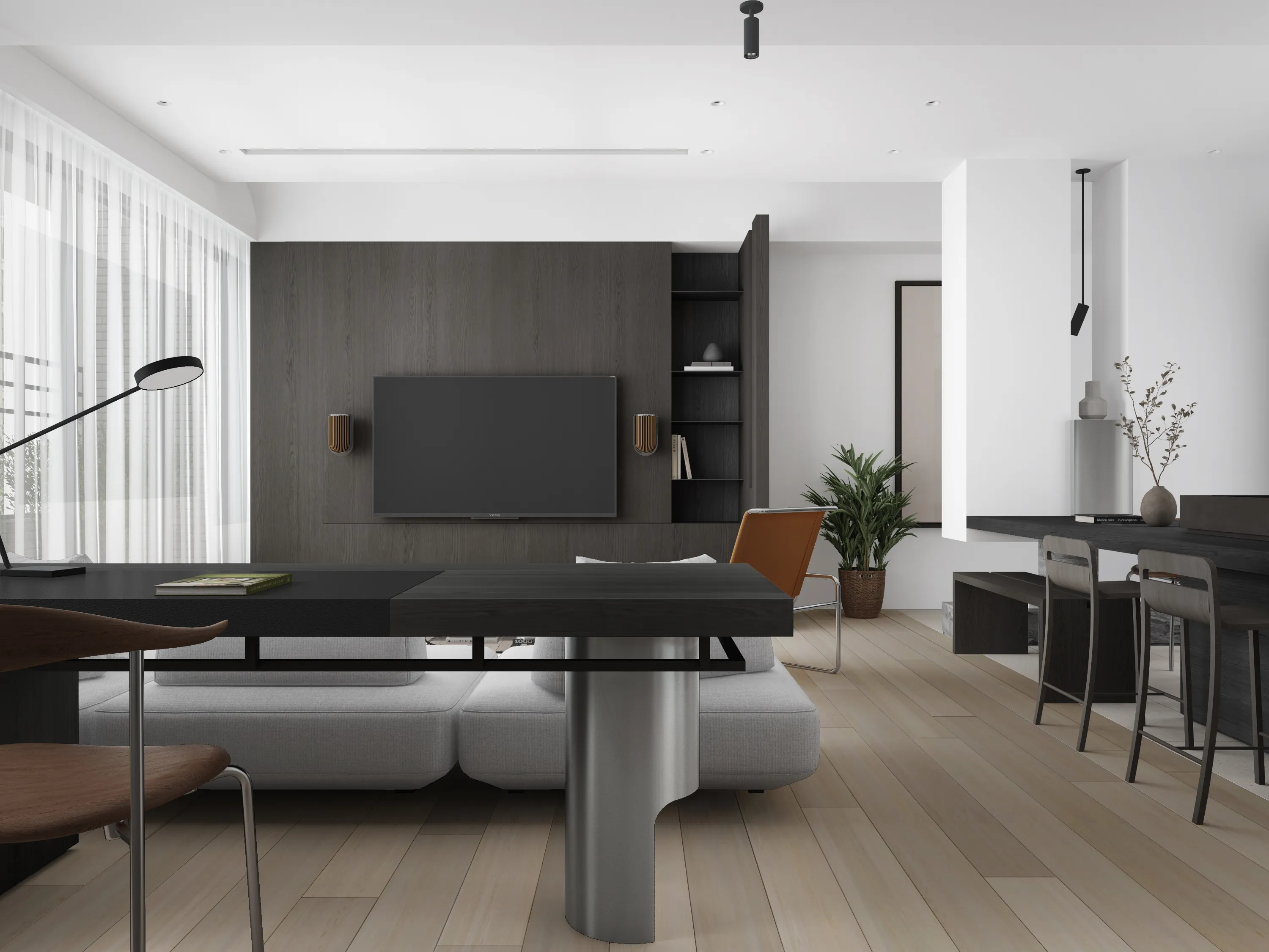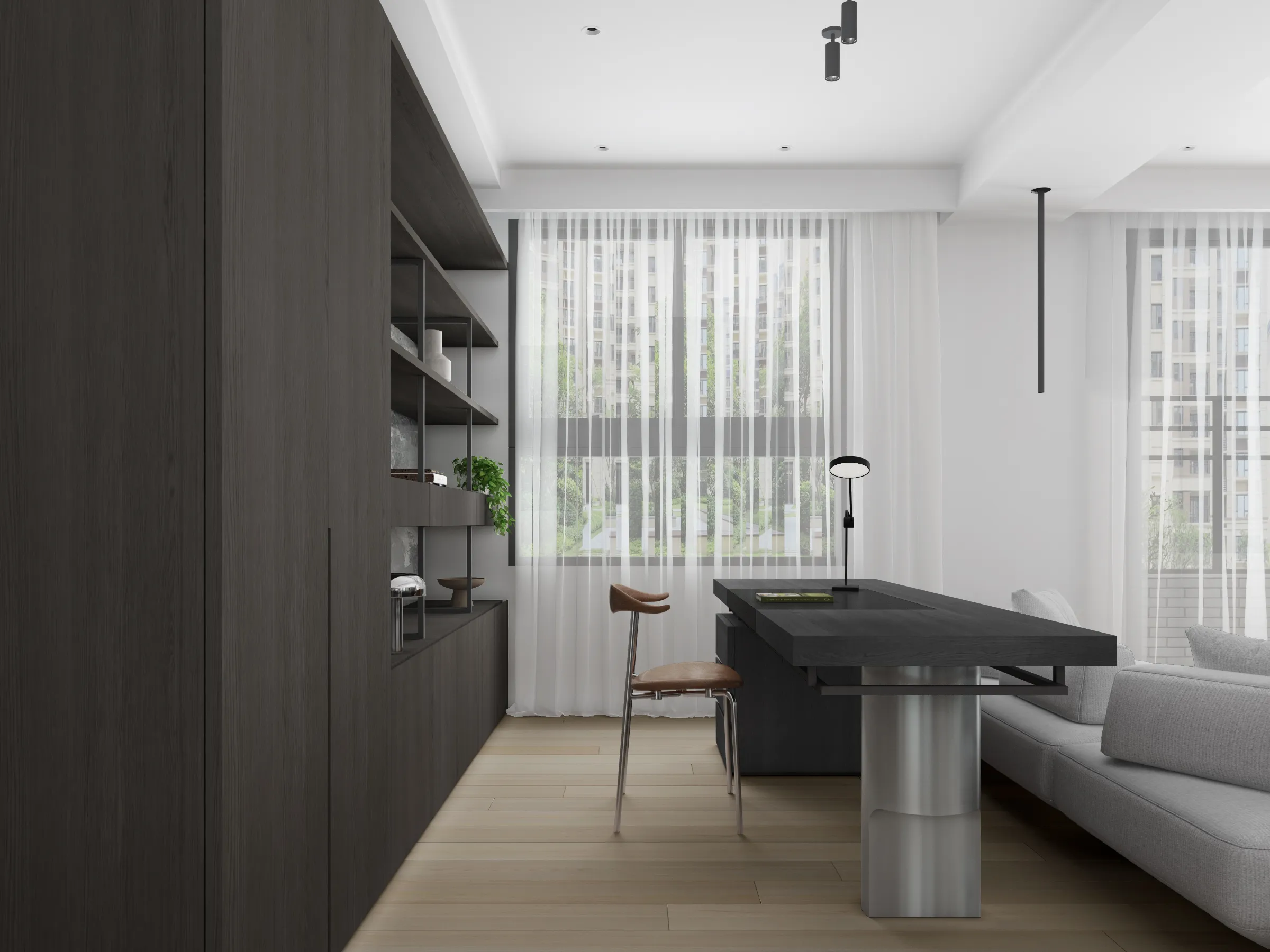 Spaces that truly stand the test of time are not built on accumulation, but on proportion. Dark wood veneer, stone-textured shelving, and restrained white walls are paired with low-saturation furnishings and clean, precise lines. Together, they quiet the space, allowing the quality of everyday living to naturally come forward. What we value has always gone beyond how a space looks. It’s about whether one can genuinely feel at ease, grounded, and still find comfort in it after living there for years. From the proportions of cabinetry and the junctions between materials, to the relationships between the desk, sofa, display shelving, and circulation—every seemingly simple composition is the result of continuous refinement. Design is not about filling a space,but about ensuring that every part of it feels just right.