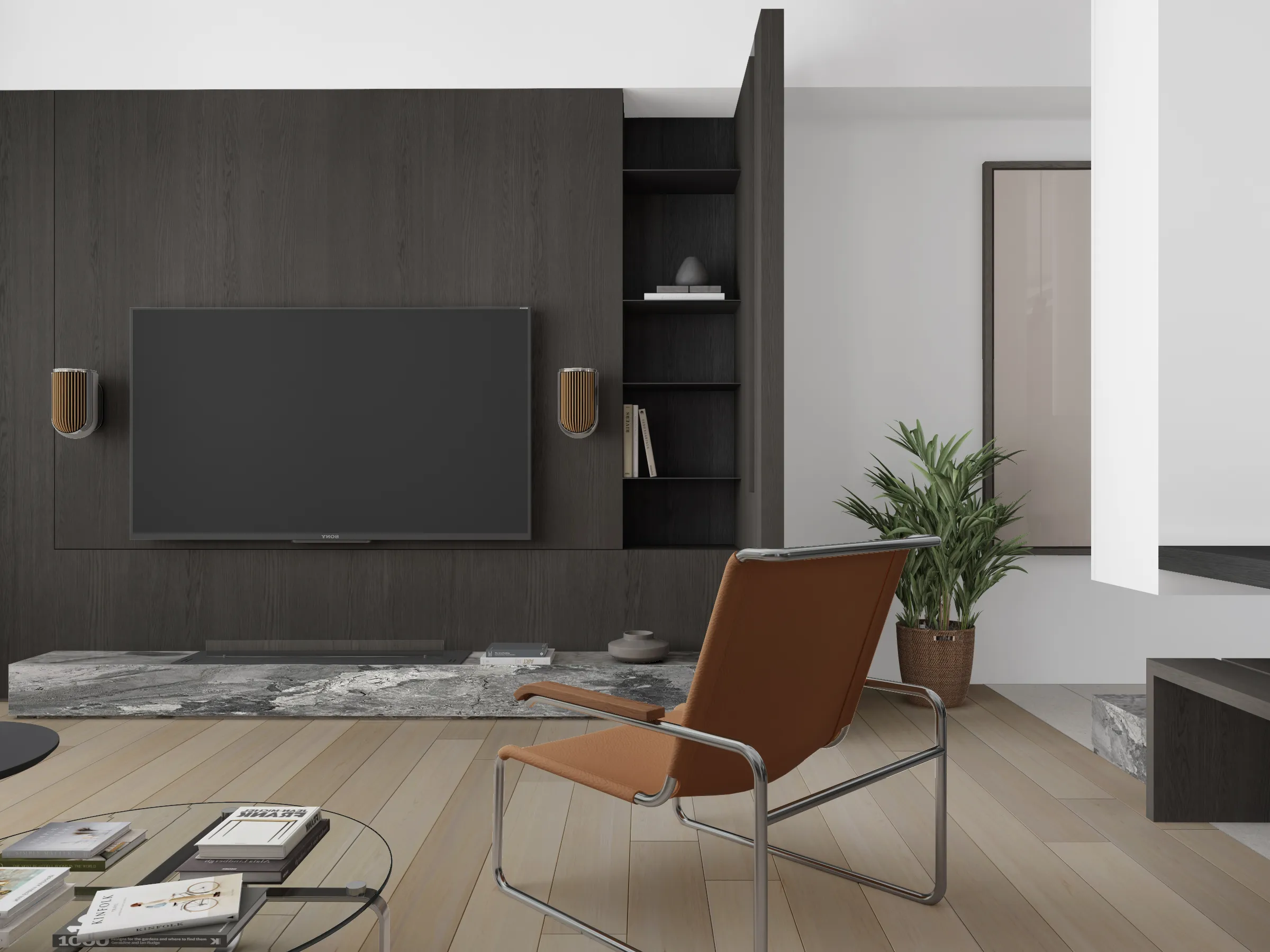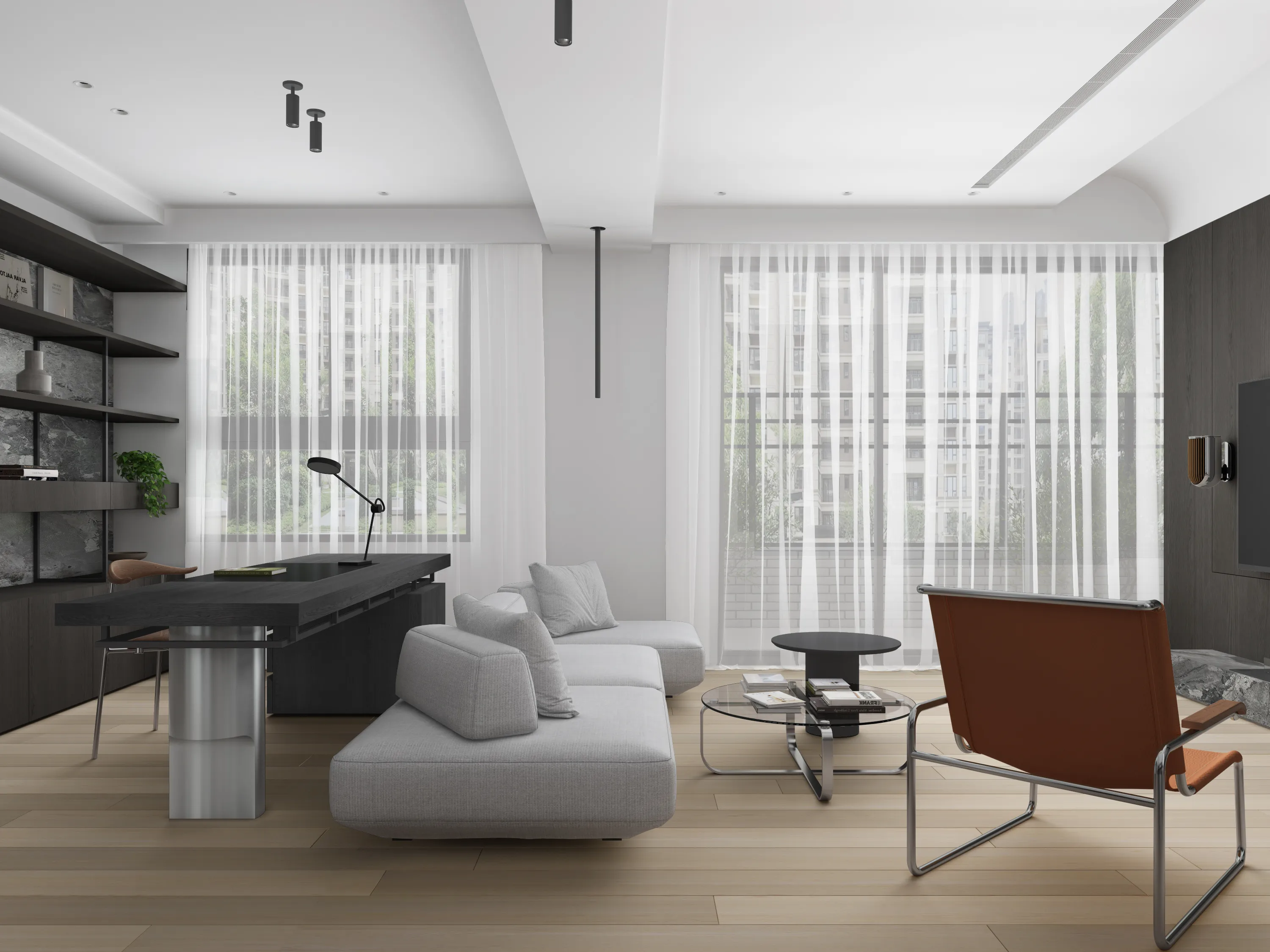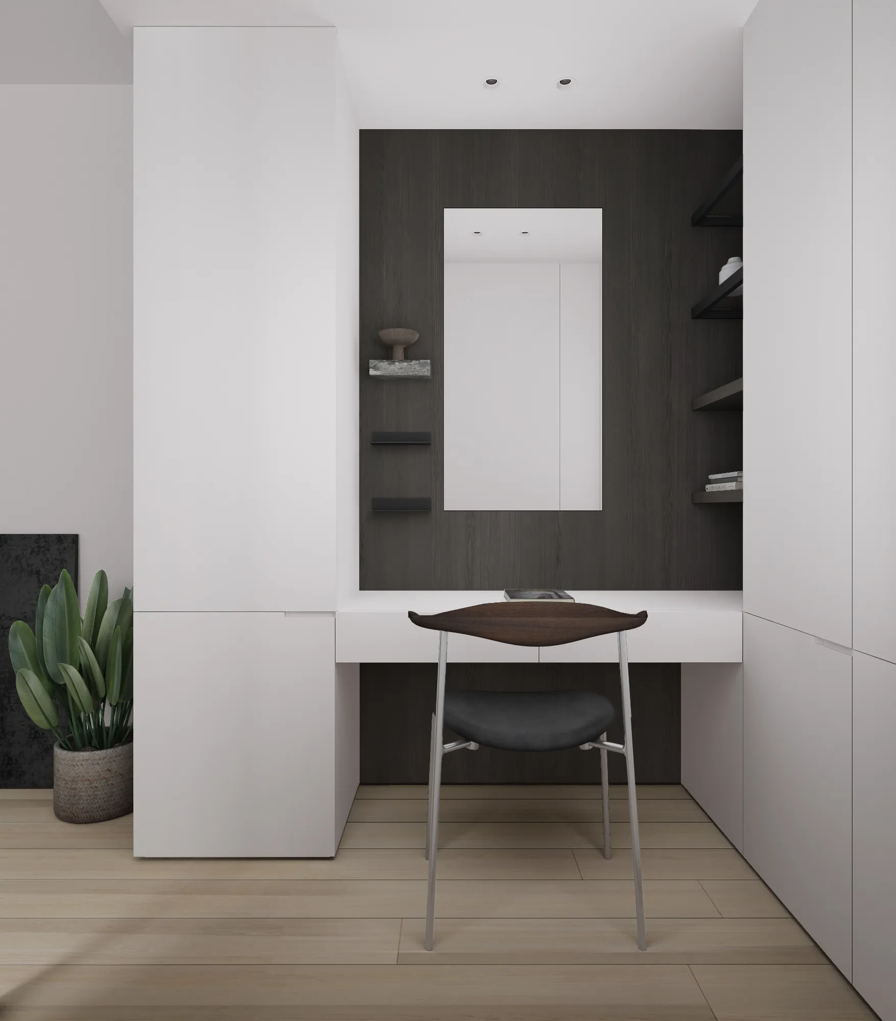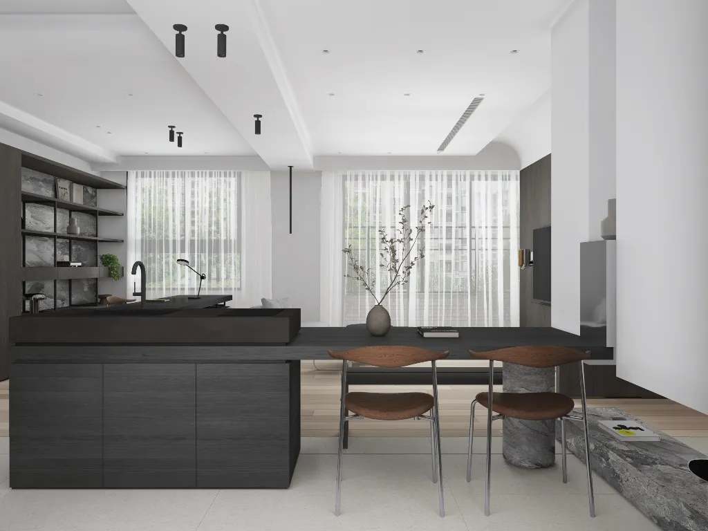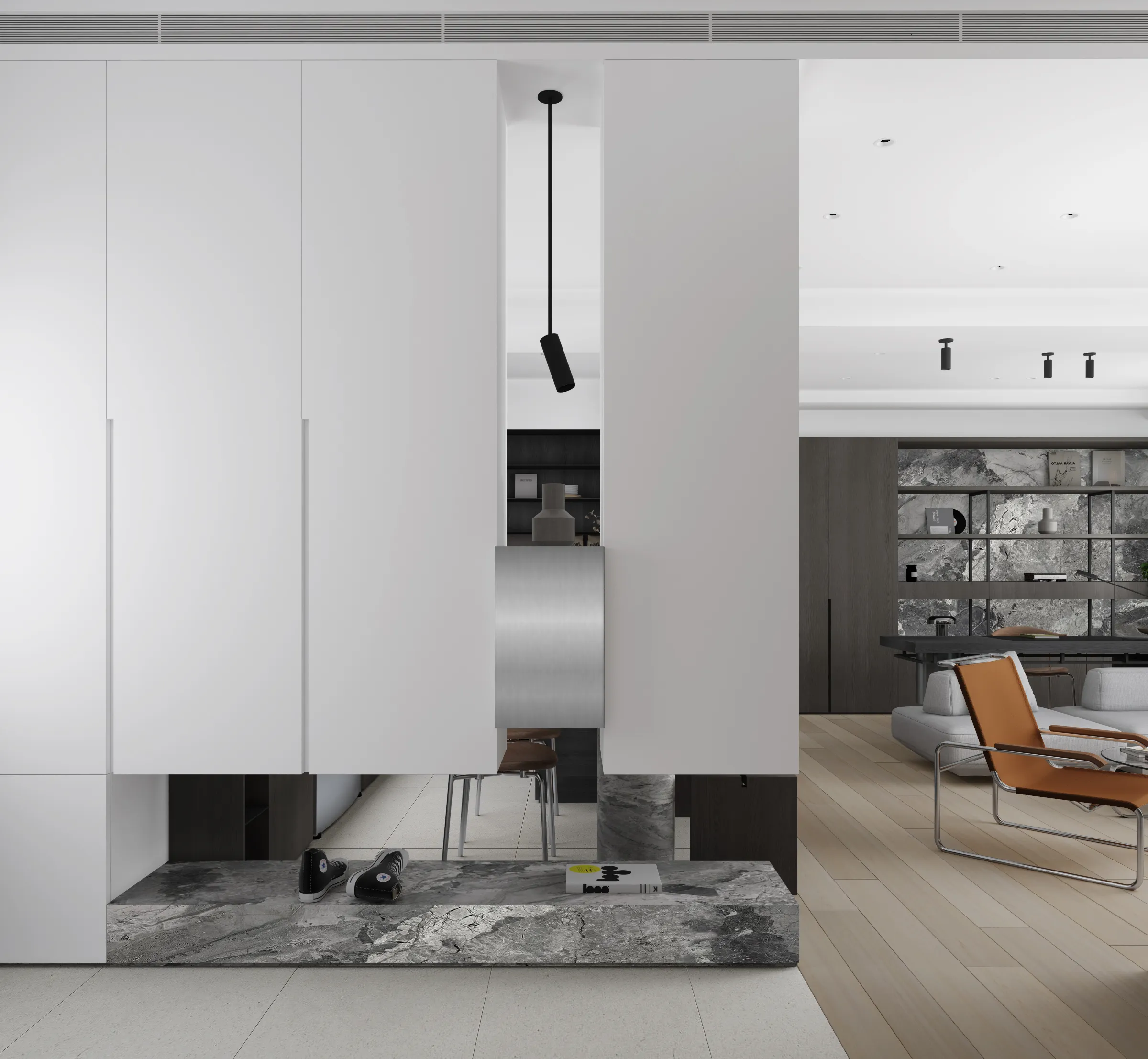Spaces that truly stand the test of time are not built on accumulation, but on proportion. Dark wood veneer, stone-textured shelving, and restrained white walls are paired with low-saturation furnishings and clean, precise lines. Together, they quiet the space, allowing the quality of everyday living to naturally come forward. What we value has always gone beyond how a space looks. It’s about whether one can genuinely feel at ease, grounded, and still find comfort in it after living there for years. From the proportions of cabinetry and the junctions between materials, to the relationships between the desk, sofa, display shelving, and circulation—every seemingly simple composition is the result of continuous refinement. Design is not about filling a space,but about ensuring that every part of it feels just right.