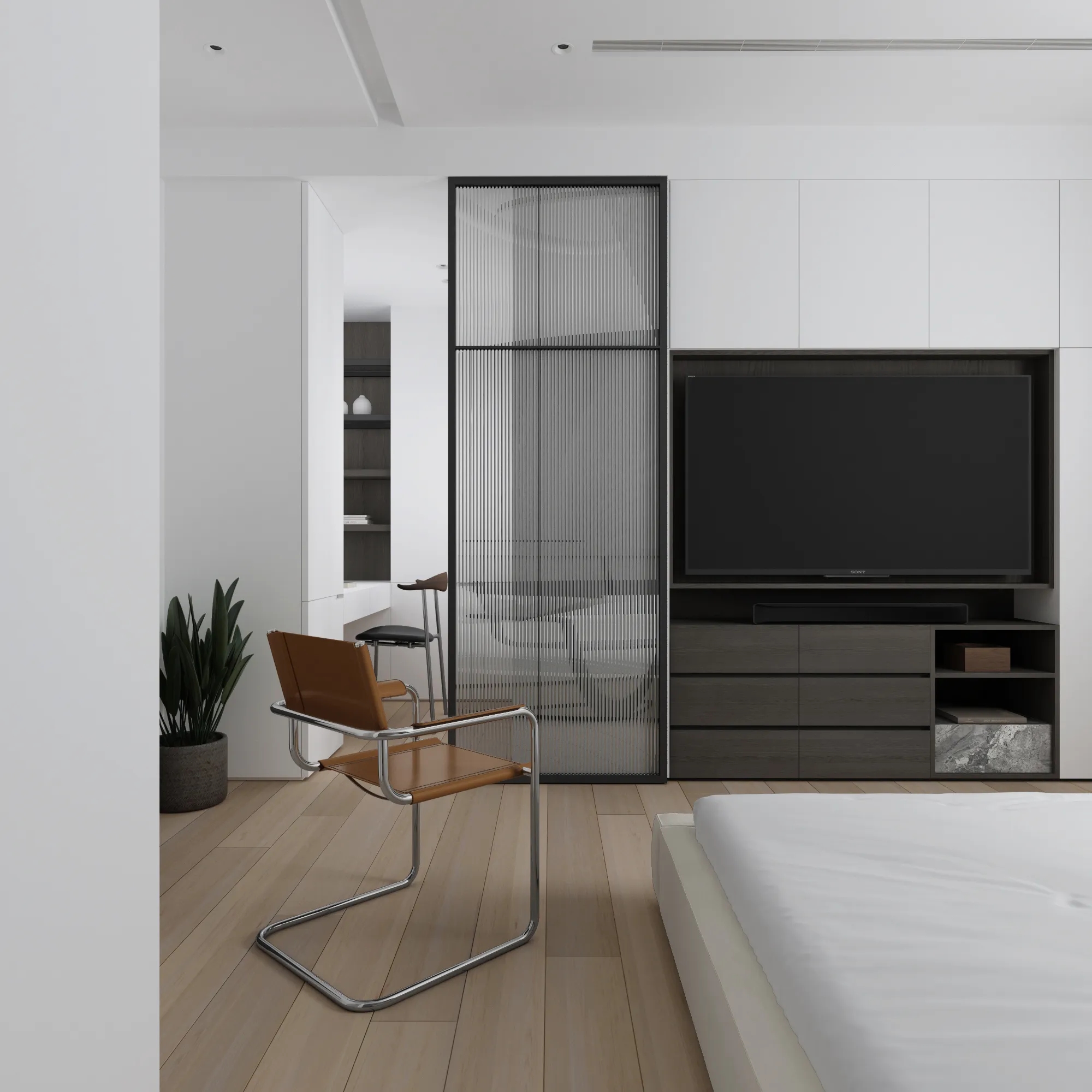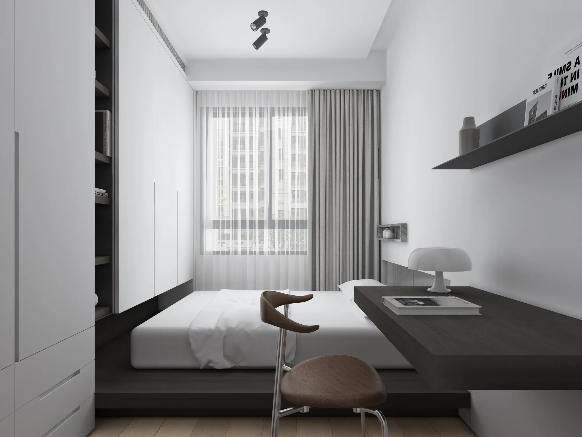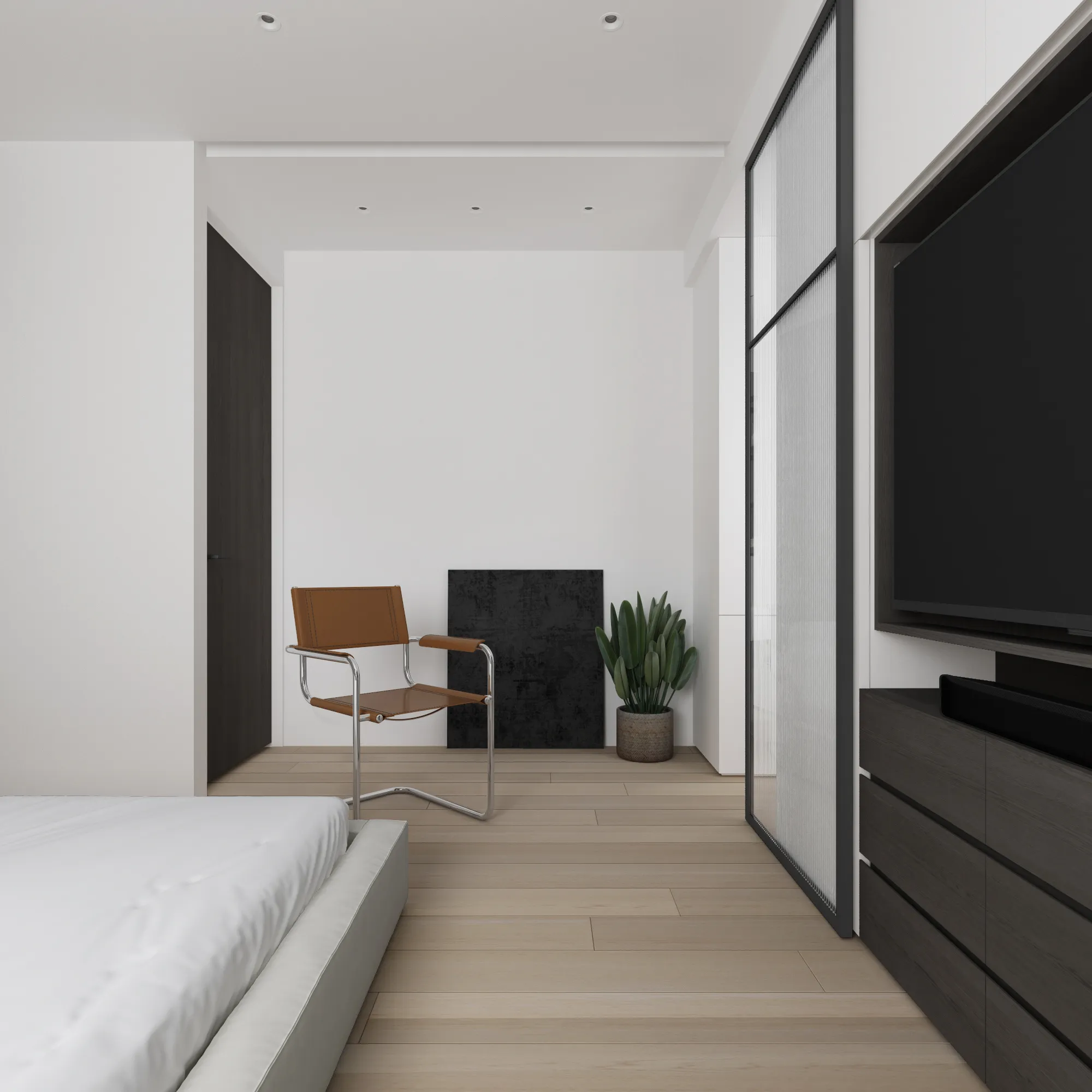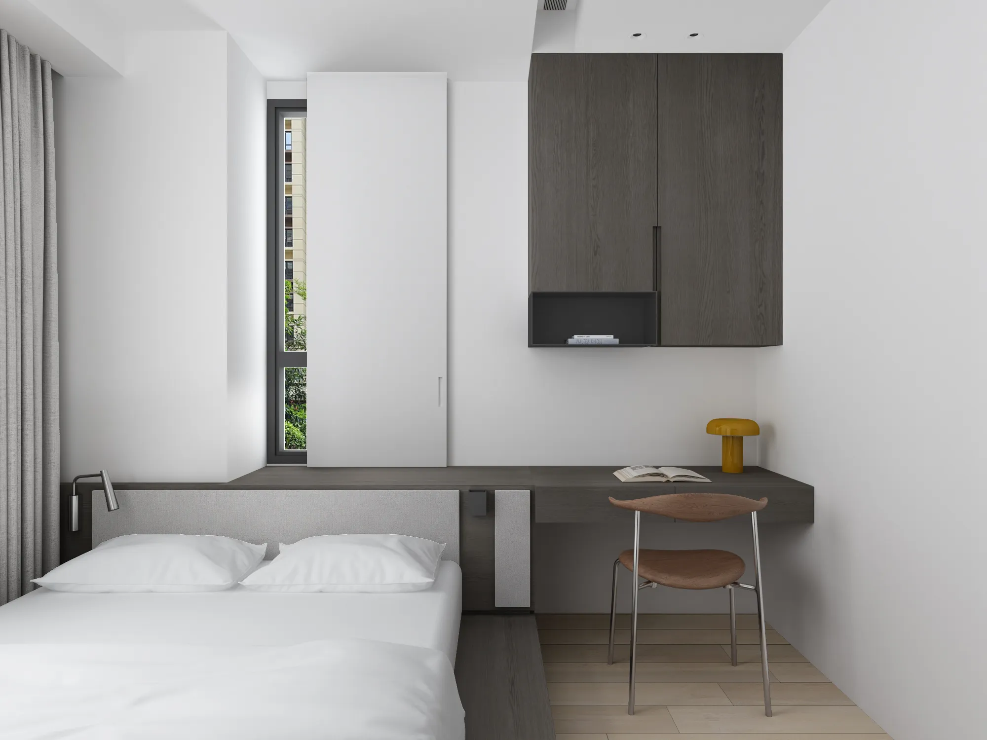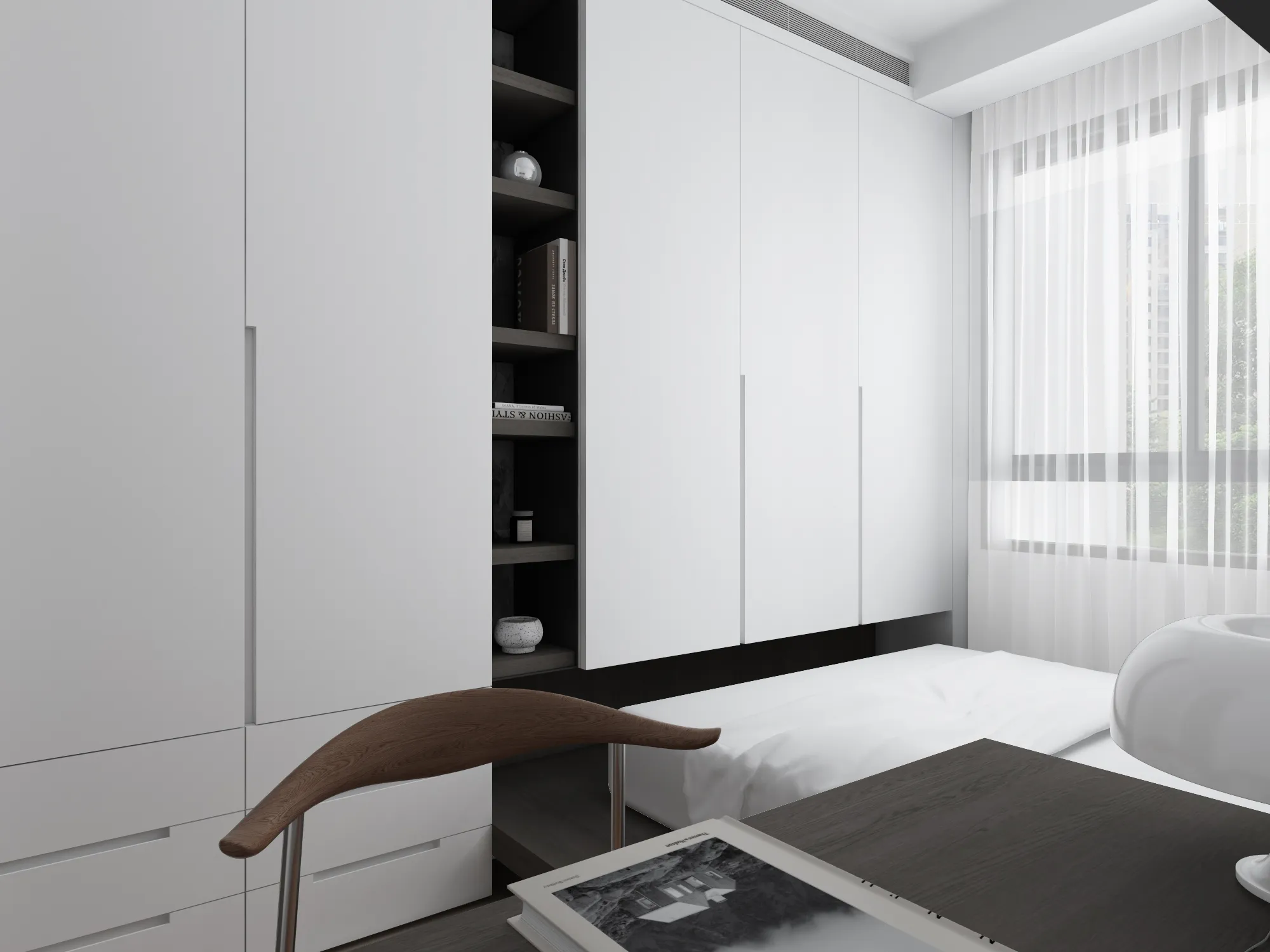 Spaces that truly stand the test of time are not built on accumulation, but on proportion. Dark wood veneer, stone-textured shelving, and restrained white walls are paired with low-saturation furnishings and clean, precise lines. Together, they quiet the space, allowing the quality of everyday living to naturally come forward. What we value has always gone beyond how a space looks. It’s about whether one can genuinely feel at ease, grounded, and still find comfort in it after living there for years. From the proportions of cabinetry and the junctions between materials, to the relationships between the desk, sofa, display shelving, and circulation—every seemingly simple composition is the result of continuous refinement. Design is not about filling a space,but about ensuring that every part of it feels just right.