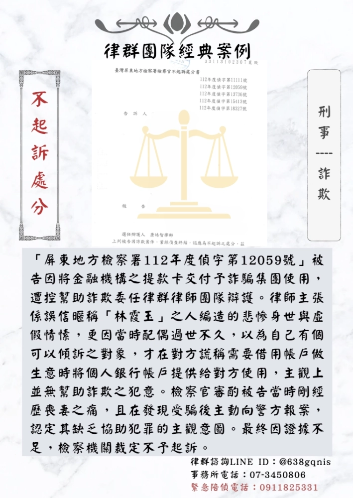 「屏東地方檢察署112年度偵字第12059號」被告因將金融機構之提款卡交付予詐騙集團使用,遭控幫助詐欺委任律群律師團隊辯護。律師主張係誤信暱稱「林霞玉」之人編造的悲慘身世與虛假情愫,更因當時配偶過世不久,以為自己有個可以傾訴之對象,才在對方謊稱需要借用帳戶做生意時將個人銀行帳戶提供給對方使用,主觀上並無幫助詐欺之犯意。檢察官審酌被告當時剛經歷喪妻之痛,且在發現受騙後主動向警方報案,認定其缺乏協助犯罪的主觀意圖。最終因證據不足,檢察機關裁定不予起訴。
