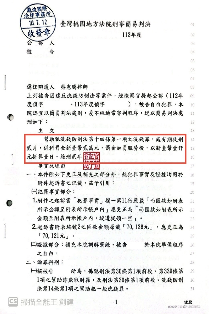 • 洗錢防制法緩刑貳年