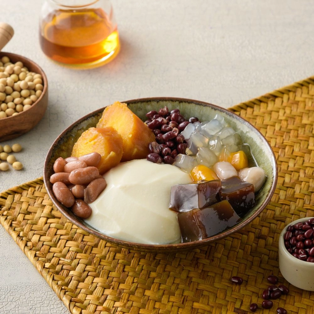 嚴選加拿大非基改黃豆、以日本壓榨脫渣技術,極速加熱蒸煮、直火熬煮,製作的傳統手工豆花、加上地瓜、黑糖粉粿、紅豆、粉角、大豆、綜合芋圓,最後再淋上香濃手工炒糖。