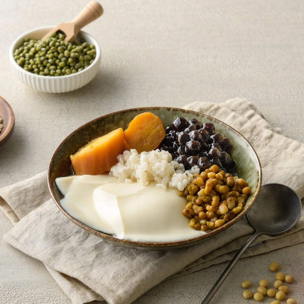 炒糖豆花+加購好料:地瓜、薏仁、珍珠、綠豆