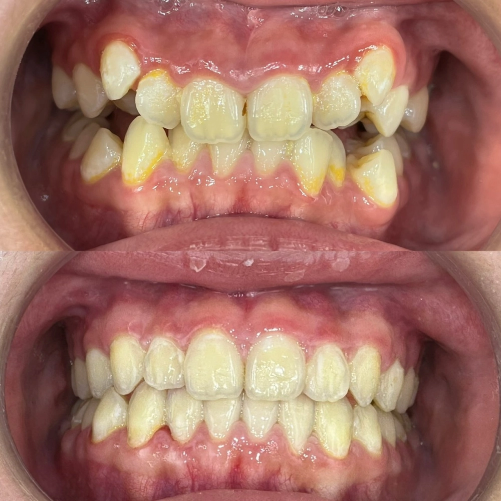 案例術前明顯齒列擁擠與咬合不正,前牙排列不齊、接觸關係不穩定,部分區域出現清潔不易而導致的色素沉積與牙齦發炎風險。
