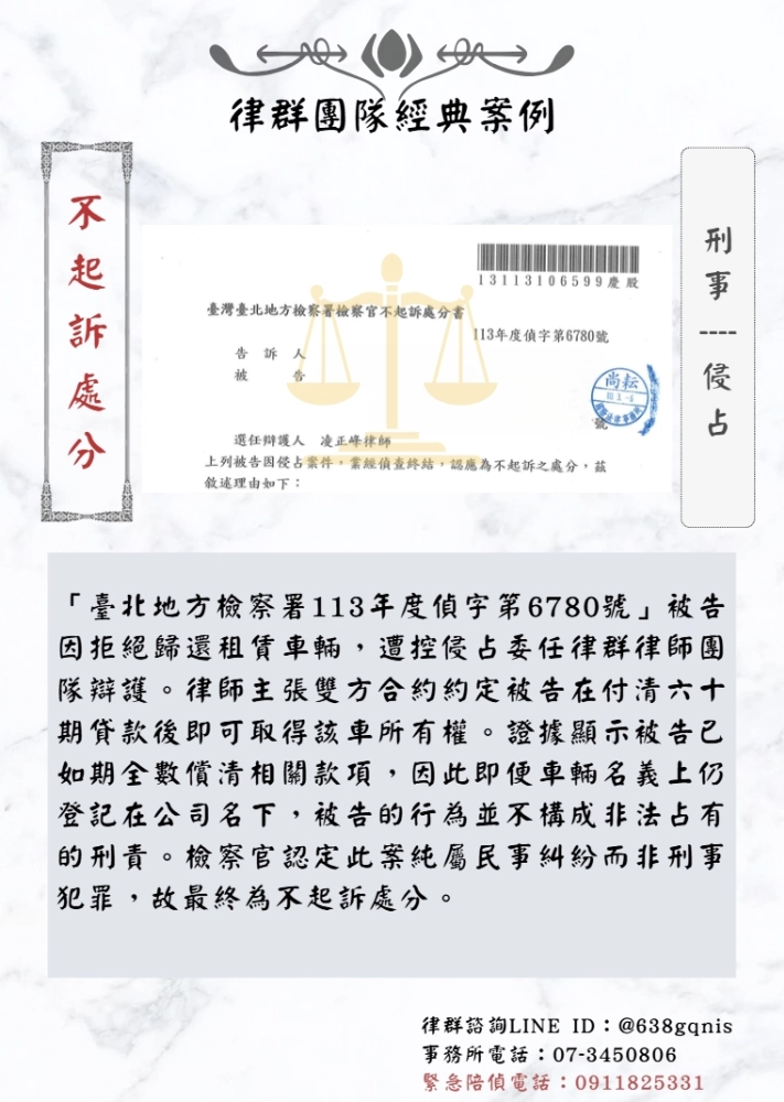 「臺北地方檢察署113年度偵字第6780號」被告因拒絕歸還租賃車輛,遭控侵占委任律群律師團隊辯護。律師主張雙方合約約定被告在付清六十期貸款後即可取得該車所有權。證據顯示被告已如期全數償清相關款項,因此即便車輛名義上仍登記在公司名下,被告的行為並不構成非法占有的刑責。檢察官認定此案純屬民事糾紛而非刑事犯罪,故最終為不起訴處分。