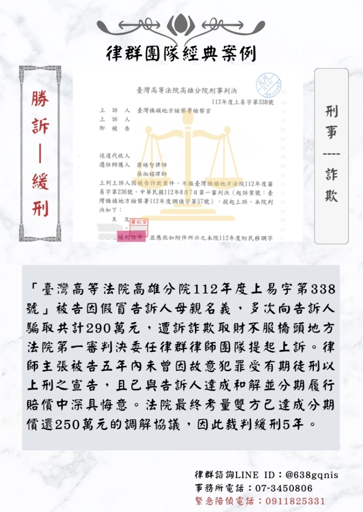 「臺灣高等法院高雄分院112年度上易字第338號」被告因假冒告訴人母親名義,多次向告訴人騙取共計290萬元,遭訴詐欺取財不服橋頭地方法院第一審判決委任律群律師團隊提起上訴。律師主張被告五年內未曾因故意犯罪受有期徒刑以上刑之宣告,且已與告訴人達成和解並分期履行賠償中深具悔意。法院最終考量雙方已達成分期償還250萬元的調解協議,因此裁判緩刑5年。
