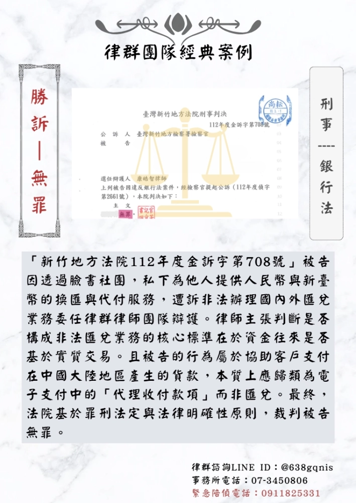 「新竹地方法院112年度金訴字第708號」被告因透過臉書社團,私下為他人提供人民幣與新臺幣的換匯與代付服務,遭訴非法辦理國內外匯兌業務委任律群律師團隊辯護。律師主張判斷是否構成非法匯兌業務的核心標準在於資金往來是否基於實質交易。且被告的行為屬於協助客戶支付在中國大陸地區產生的貨款,本質上應歸類為電子支付中的「代理收付款項」而非匯兌。最終,法院基於罪刑法定與法律明確性原則,裁判被告無罪。